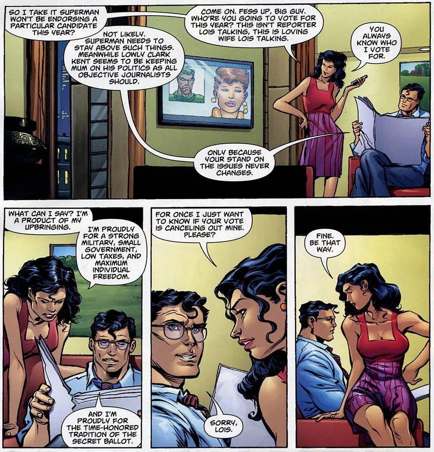 >>152497209Superman is actually pretty mum on what his politics are. Which is probably for the best.