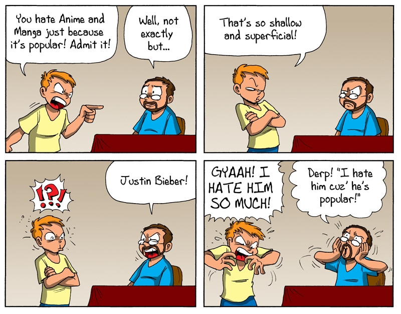 >>152510242Feels like it only works from Dobson's perspective because he's an artist.Bieber was despised not for being popular but for being completely inescapable if you had a little sister or a cousin or whatever.What kids today will never comprehend is how fucking annoying "Baby" was. In hindsight I can listen to his other songs like "Never say never" and I'm fine, but "Baby" in particular just triggers something because it was constantly on the radio or being played in the store, and if you had a sister, constantly blared from her bedroom.Combine that with the extremely repetitive nature of the song? Yeah, you wanted to bang your head on a wall.