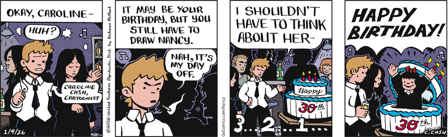 >>152515652Jerry Scott's is not bad. It's not very Nancy-ish, and he drew it more in his style, so it's odd as it looks like Zits and Baby Blues.But, it's okay. It's pretty different, but he's a solid cartoonist.Lasky I don't know much about. He didn't do it long, as he died of cancer soon after taking over.