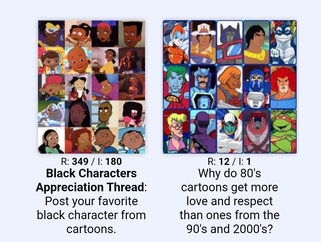 >>152516228They had cooler concepts and designs because of the toyetic nature of cartoons back then. 90s and 2000s is basically all comedy shit that people won't remember unless they watched several episodes of it. Seeing snippets of and having nostalgia for something like Thundercats is easier because it just looks cool and memorable regardless of how much someone actually watched it