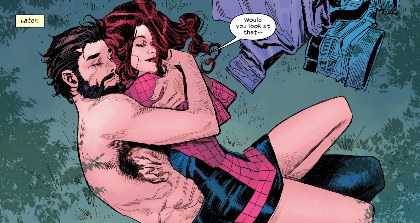 >>152546805Well, Peter having his glasses makes sense, seeing as how he didn't stop wearing them until after he received the radioactive spider from Iron Lad in issue #1.As for MJ's clothes, it was probably just a callback and I am pretty sure we've seen her wearing that outfit in other issues of USM.