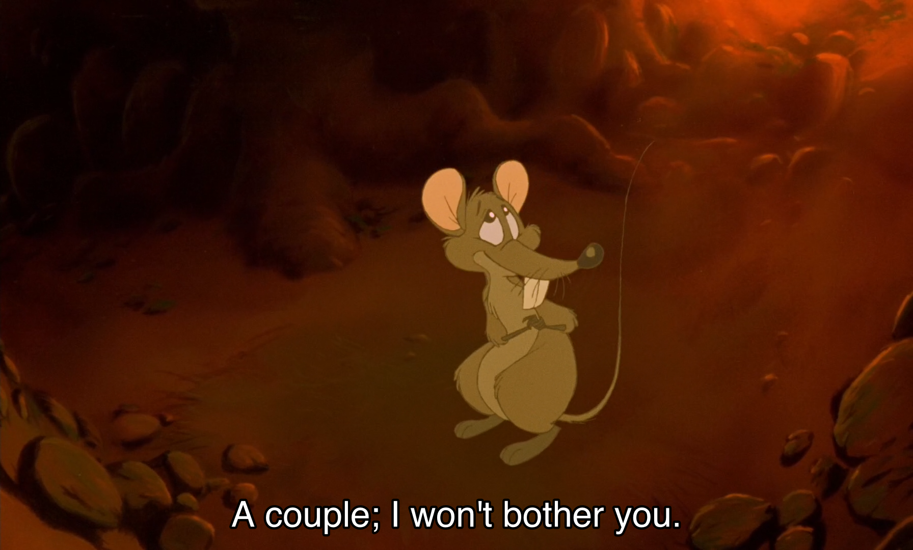 >>152572718When they set up shop in an abandoned badger's den and start getting REALLY intimate. Then a mouse gets inside, says>oh, a couple, sorry won't disturbthen the yellow and red animal look at each other, get all flustered, screen cuts to black. The next time we see Rita, it's the next morning, and she is picking flowers while Hugo is asleep.