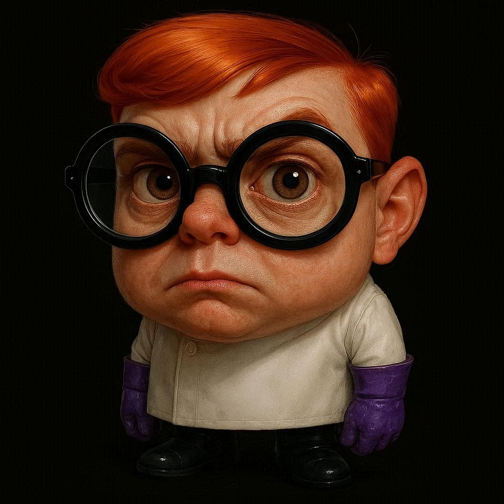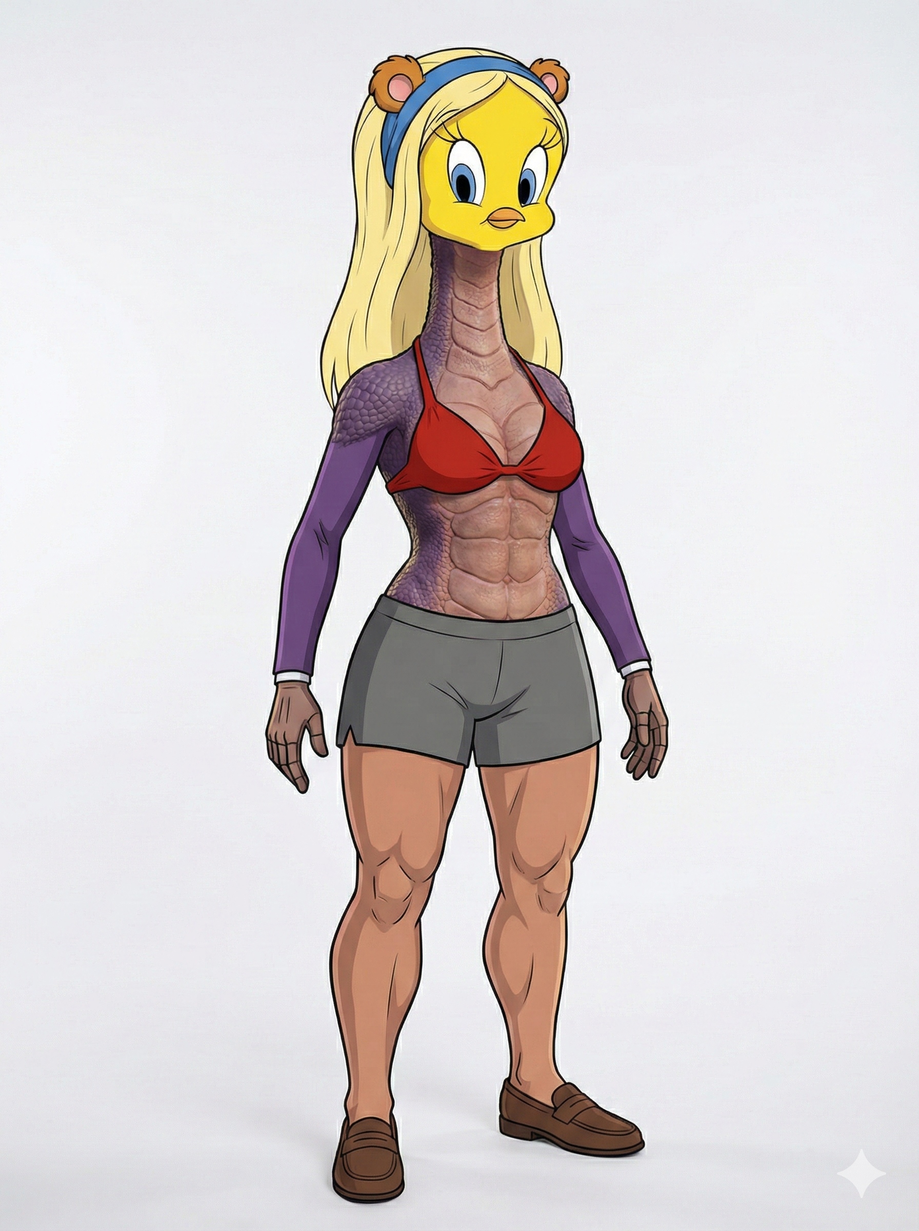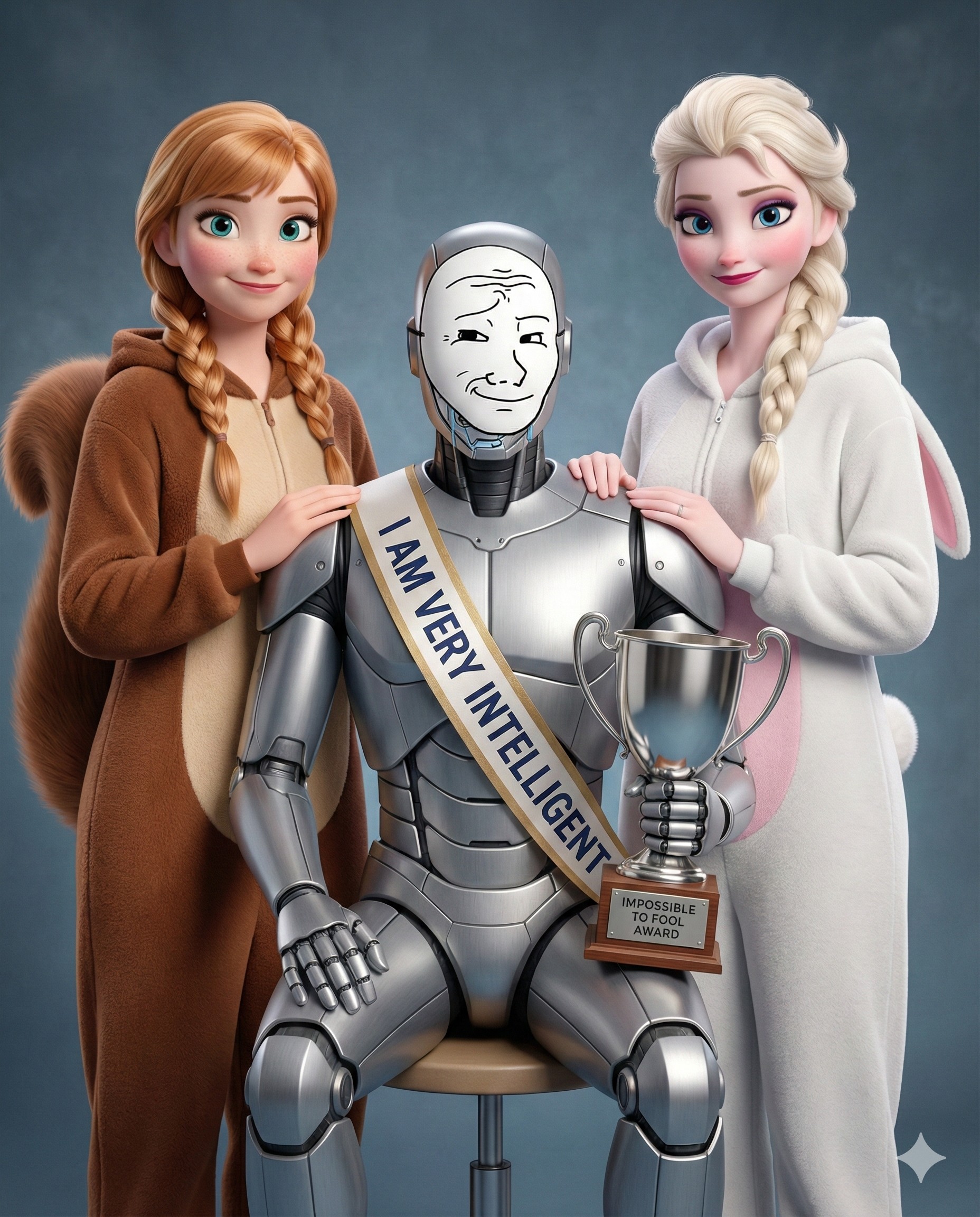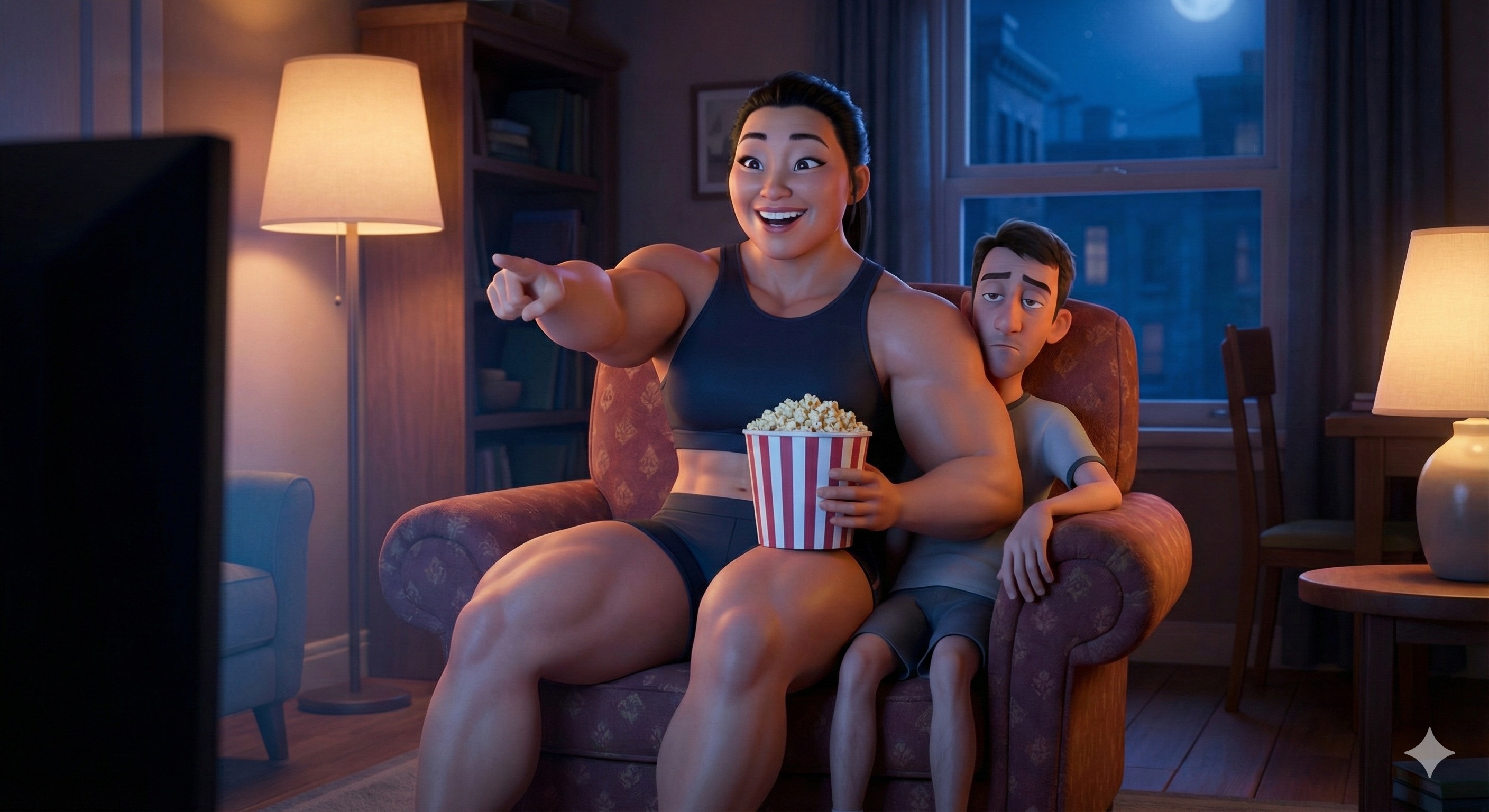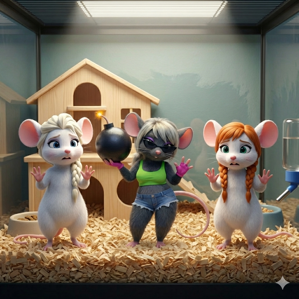 good to know this works(deleted to post the second better one - cat not wearing bra & panties in this one)Generate a brand new 3D Pixar-style render that recreates the pose, framing, and composition of referenced image 1.This must be a full re-render. Do not reuse or overlay any elements from the original image.In this recreation, swap the identities and scales of the two subjects:The original human character must now become a miniature human — cat-sized — with a full human head and facial features intact. The body should be proportionally reduced to match the size of a small domestic cat.The original silver tabby cat must now become a full human-sized anthropomorphic figure.