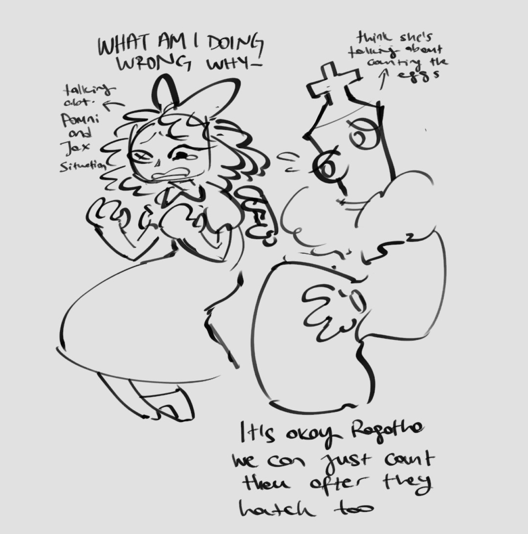 It actually makes sense that Ragathafags are such shitty people compared to Jaxfags.Ragatha is a deeply insecure people pleaser, and such people tend to be magnets for abusive people in real life because their willingness to fawn and accept blame provides a constant source of validation for the abuser. Most normal people just find this behaviour uncomfortable to navigate, as we see in Ragatha's circus experience, feeling rejected by the rest of the group because none of them know how to talk to each other.And then Jax is a deeply insecure avoidant who pushes everyone away, so the only ones who stick around are those with the required empathy, emotional security, and psychological insight to understand his pain and not take his actions too personally.And then there's me, an enlightened centrist who loves and empathises with them both, and would be privileged to watch from their cuck chair.
