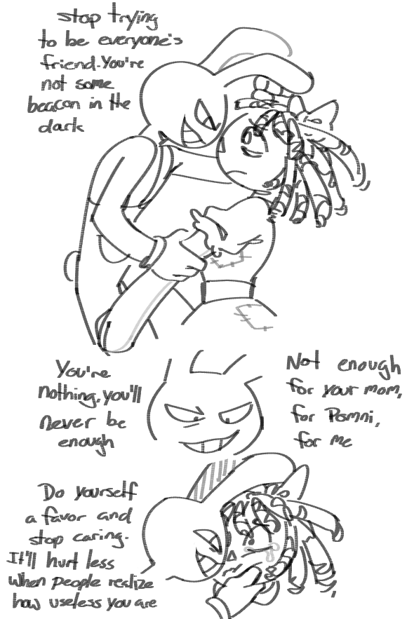 >>152579666They had to forcibly veganize him to stop being a cannibal. He regularly tortures others for his own sadistic pleasure. He would definitely kill a kitten to upset Gangle then go oh come on its just an npc or whatever then Pomni would scold Gangle for bullying him because she knows he’s neurodivergent