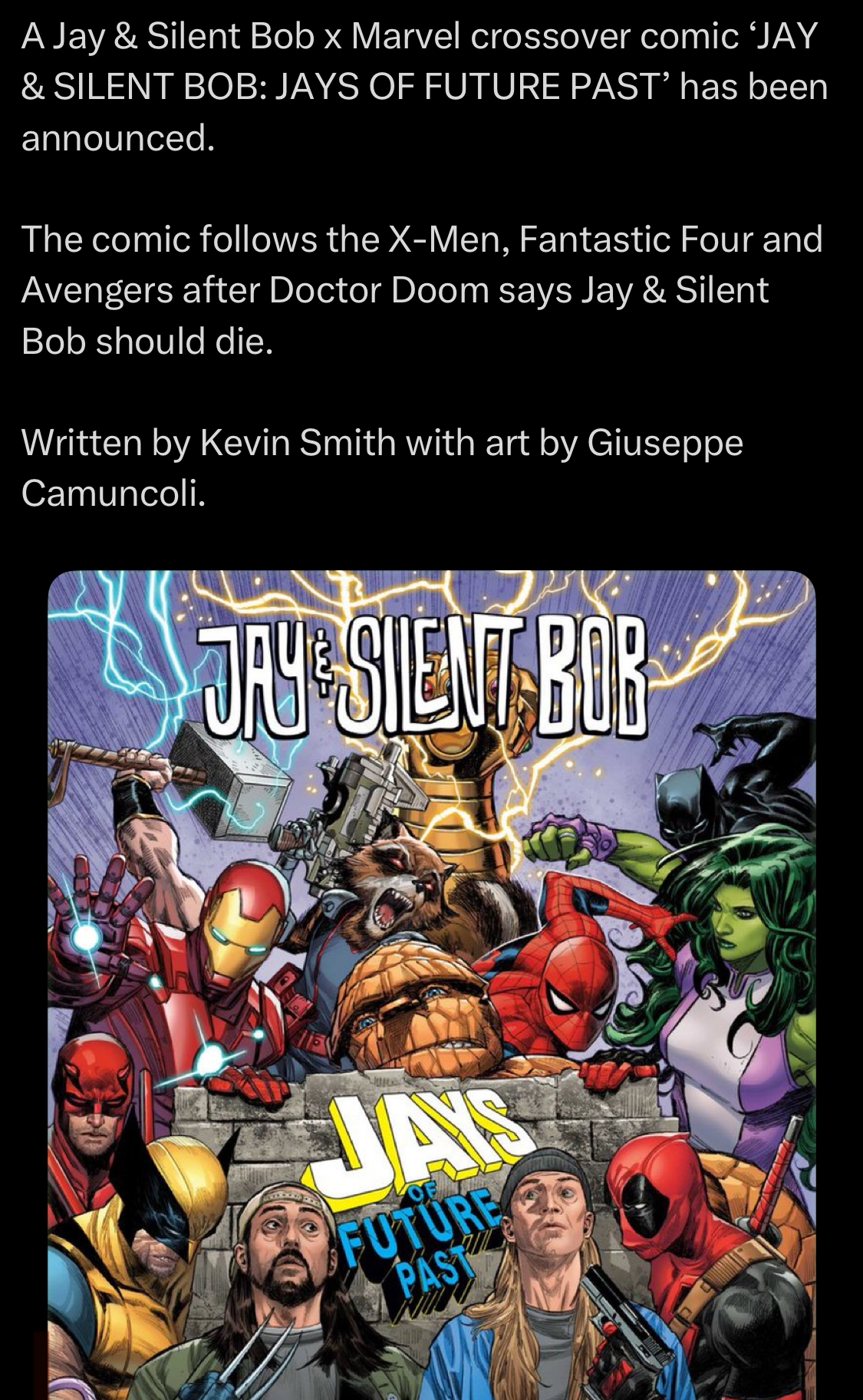 >>152569910Crossovers are all the rage right now and Marvel has been especially whorish lately. But Kevin Smith used to be a Marvel writer so of course he'd be able to strike a deal with them.