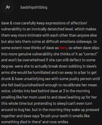 The relationship with Alpha Dave and Dirk would be worse if Dave sees anything Dirk made as 'ironically shitty'. Like Alpha Rose being suspicious and passive aggressive towards Roxy's feelings/affections for her mother.