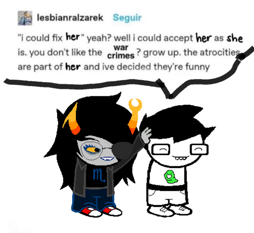 >>152589976He's too busy fucking BPD-ridden vriska cosplayers to bother with /hsg/, but off chance he's taking a break to read this thread, he should explain what's the whole deal with the alpha kid-dead troll OTPs stealthily showcased at the beginning of act 6.I could also settle for just confirming them as OTPs to mindbreak some shippers