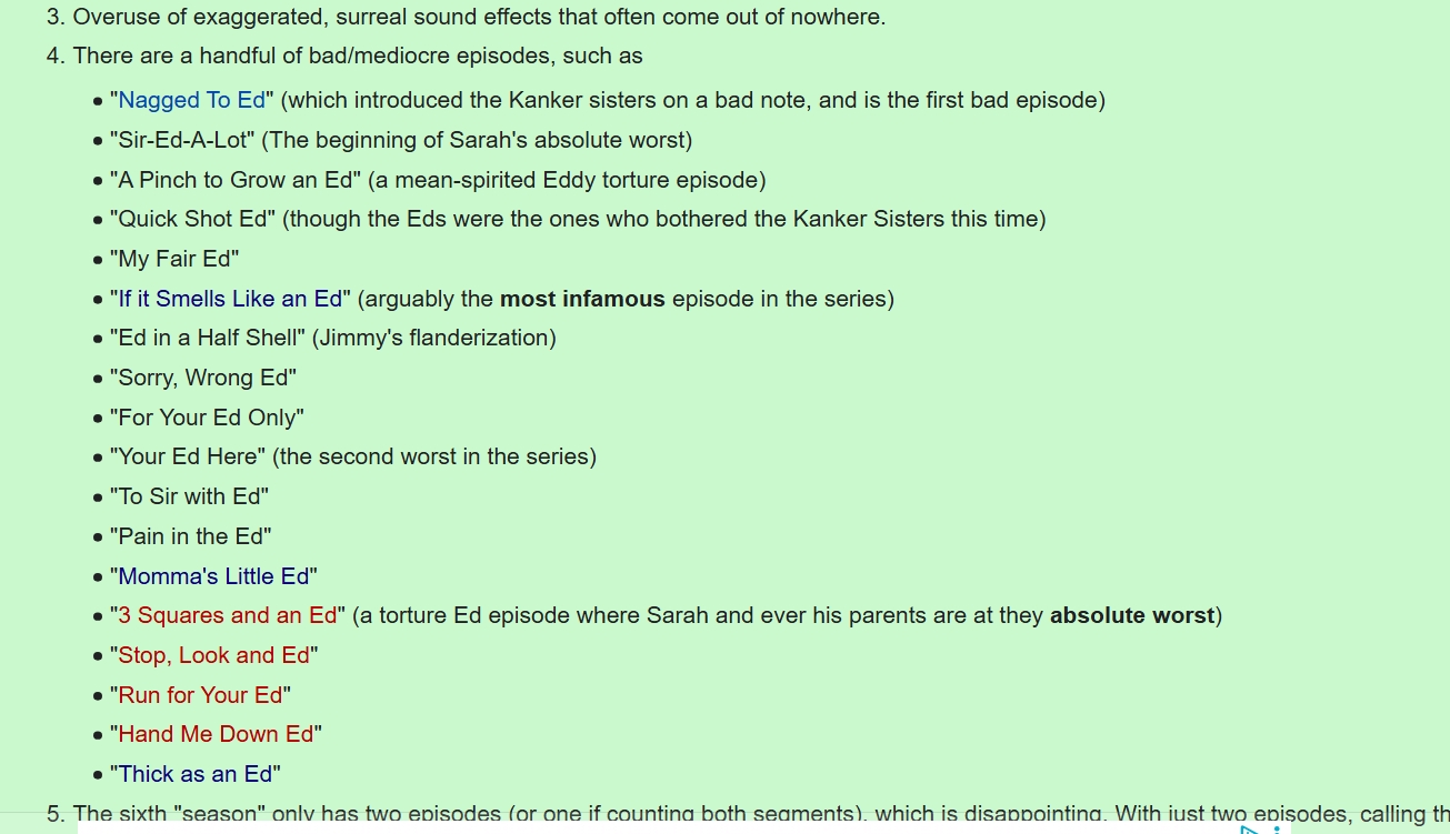 >>152576358Speaking of "if a good show has a majority of episodes that are bad, then it's bad", Qualitipedia is this stupid website.Here's their Ed, Edd n Eddy page.They say the show is good, but they list a lot of episodes as bad.That would mean it's a mid or bad show.