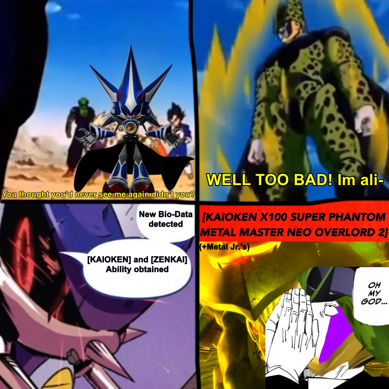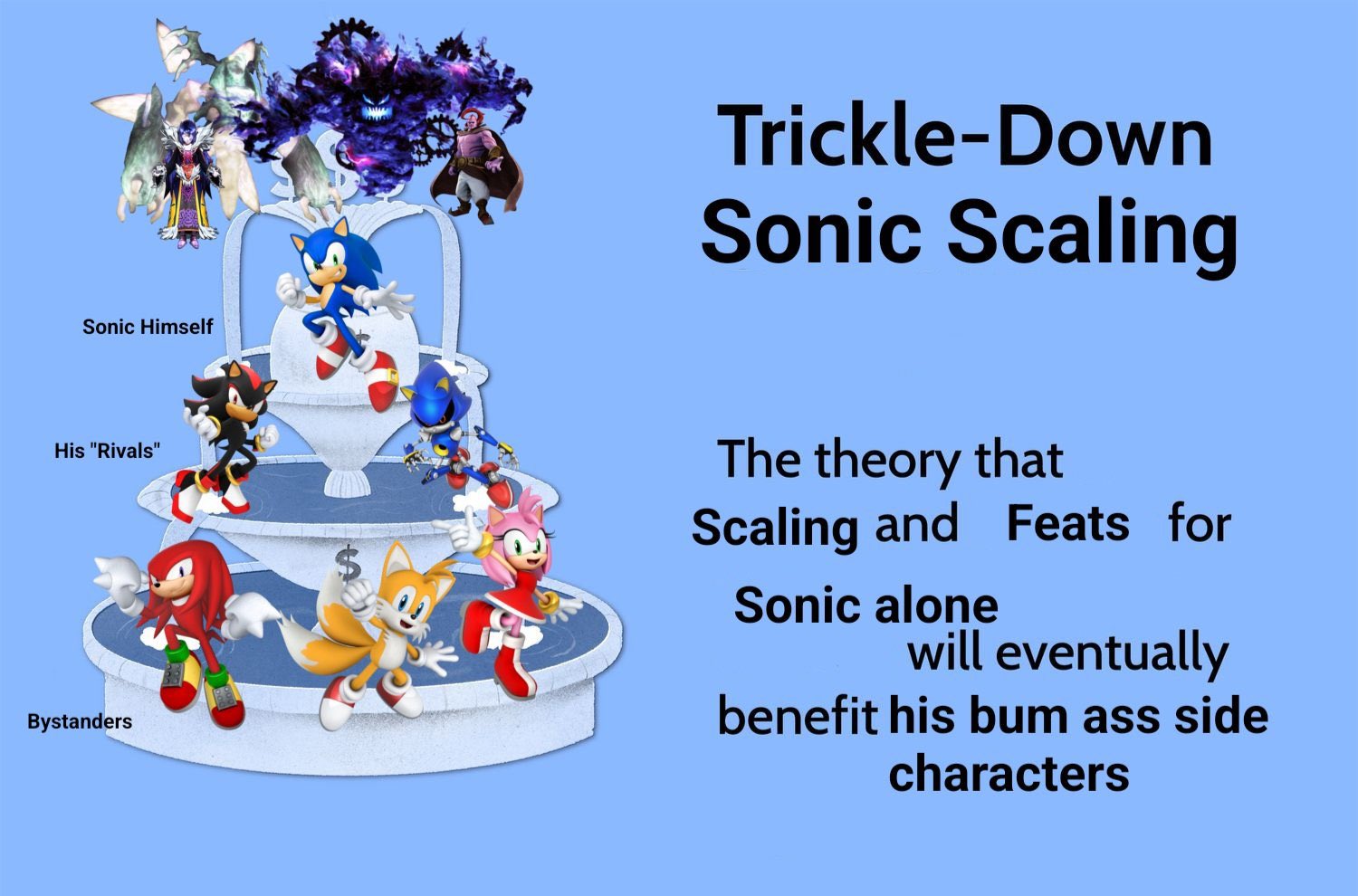 >>152582308>at best goku has broken parts of the universe in fights with equally strong enemies or when fused>super sonic would have perfectly restored an entire multiverse if he wasn't interrupted by eggman>goku can't survive in space>super sonic can>goku can't beat any god and has become beerus's bitch>super sonic has killed several gods9 out of 10 times Goku stomps but when it goes super, Sonic wins.
