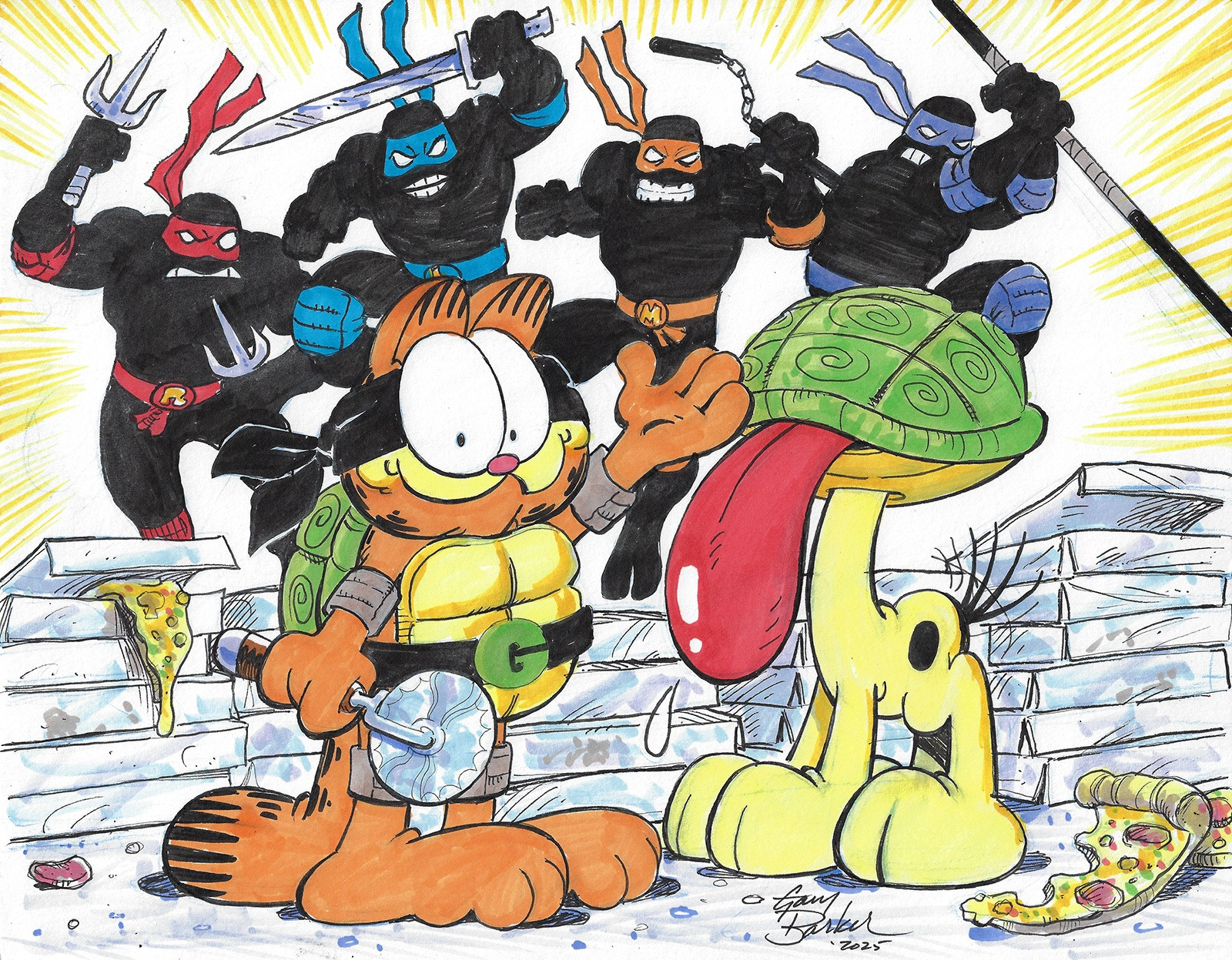 >>152582608If you want an actual answer, it's because Jim Davis' assistant on the comic strip, Gary Barker, worked for Marvel before becoming one of the leads artists on the comic strip, and gave him free reign on making Garfield characters into superheroes. He also helped create Garfello.Lately he's been drawing Garfello with TMNT after Nick had a resurgance with the idea.