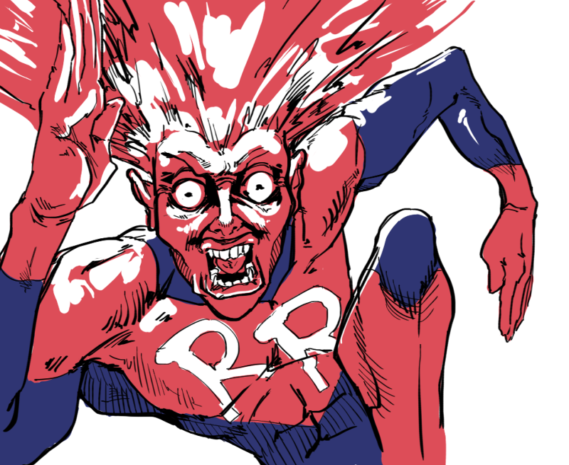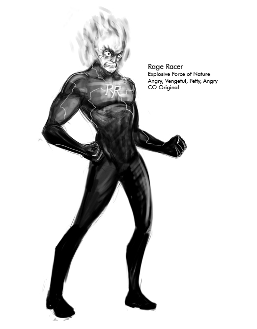 >>152592197He looks like a normal, albeit stressed, guy when not enraged. When something sets off his temper (which is very easy to do) his skin turns red and his hair bursts into flames.The madder he gets the faster he runs, but at the risk of having a heart attack.