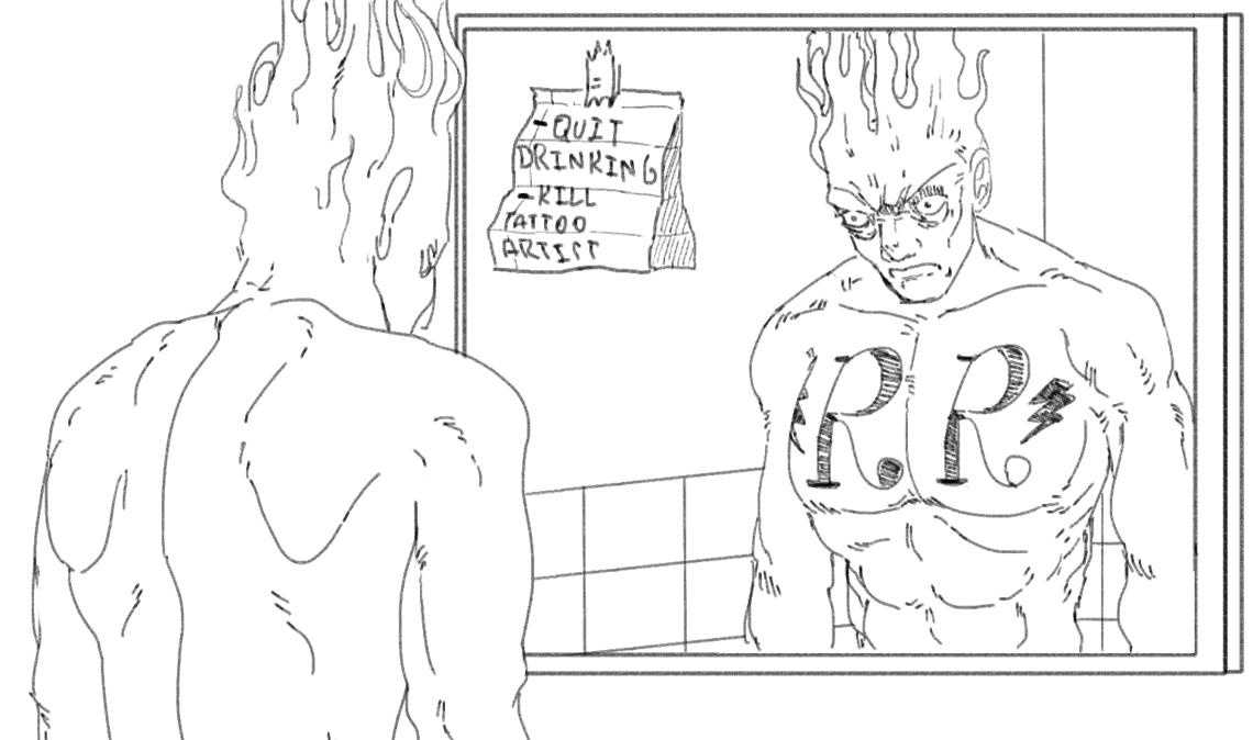 >>152602712>got drunk one night and had RR tattooed on his chestYou know what, that's great actually. I wish I thought of that while I was drawing it.