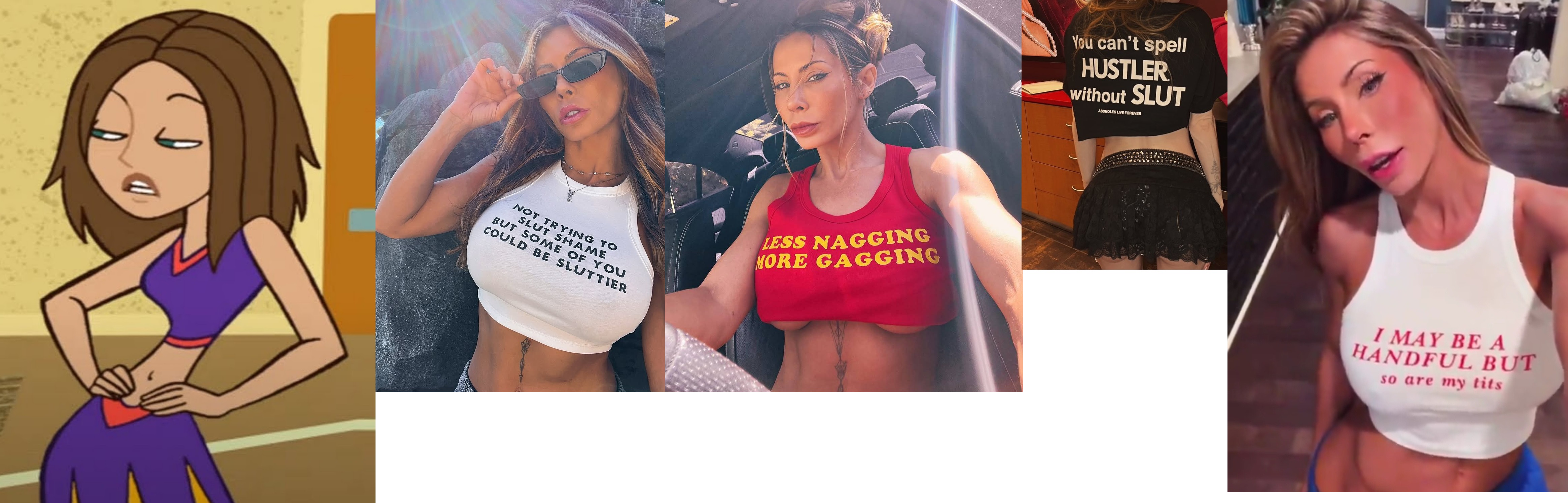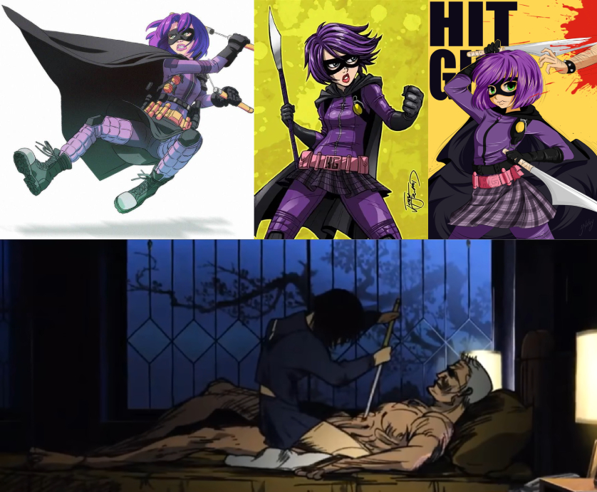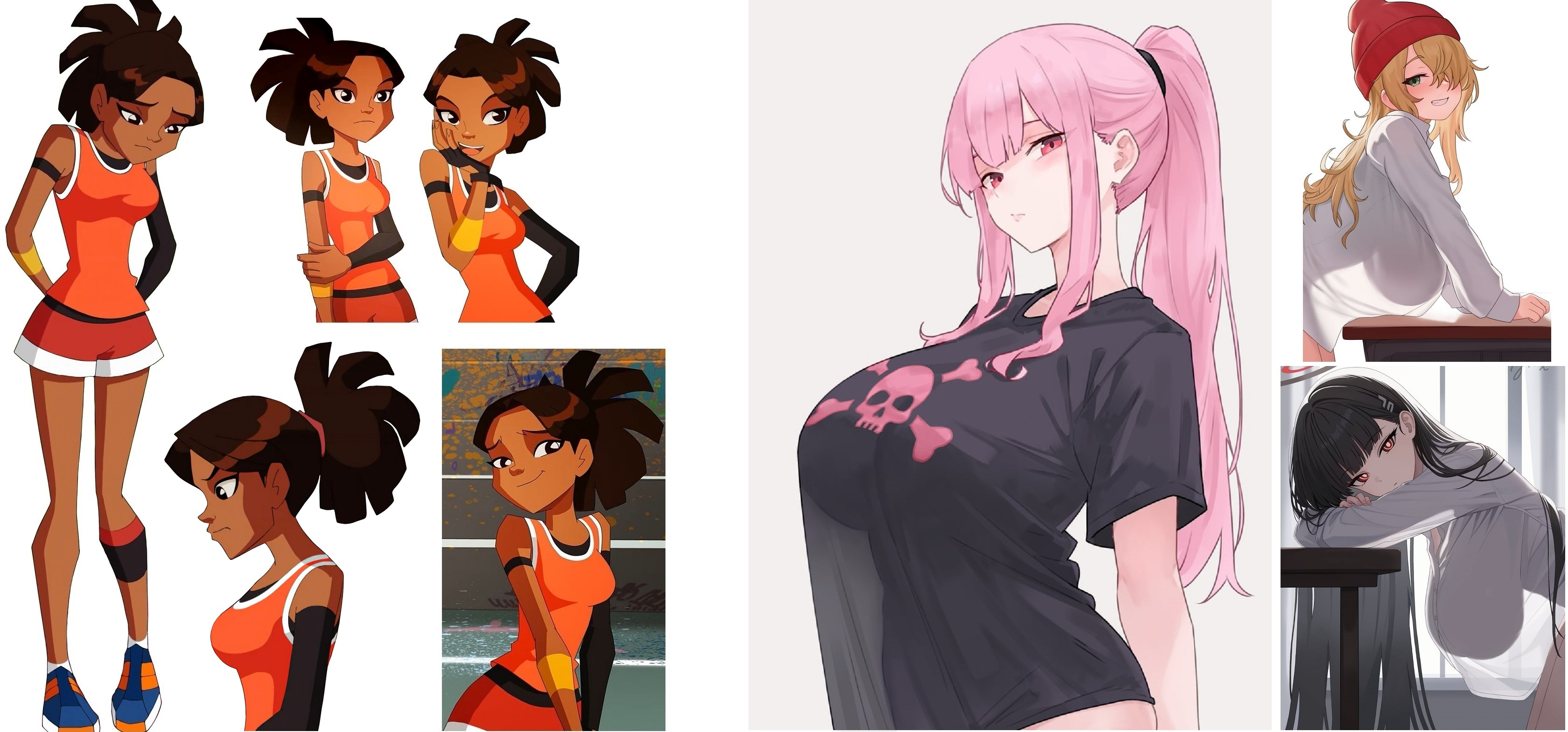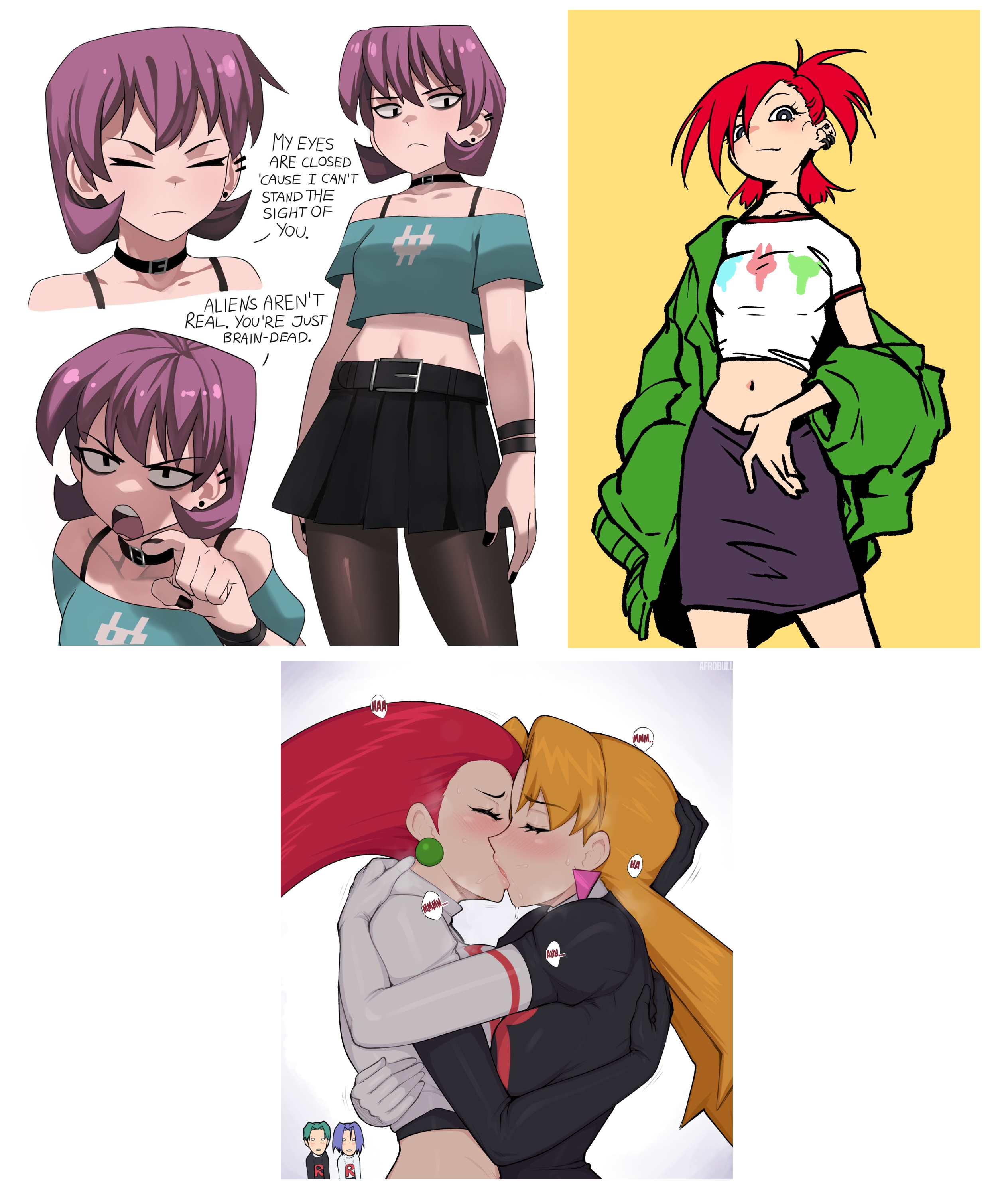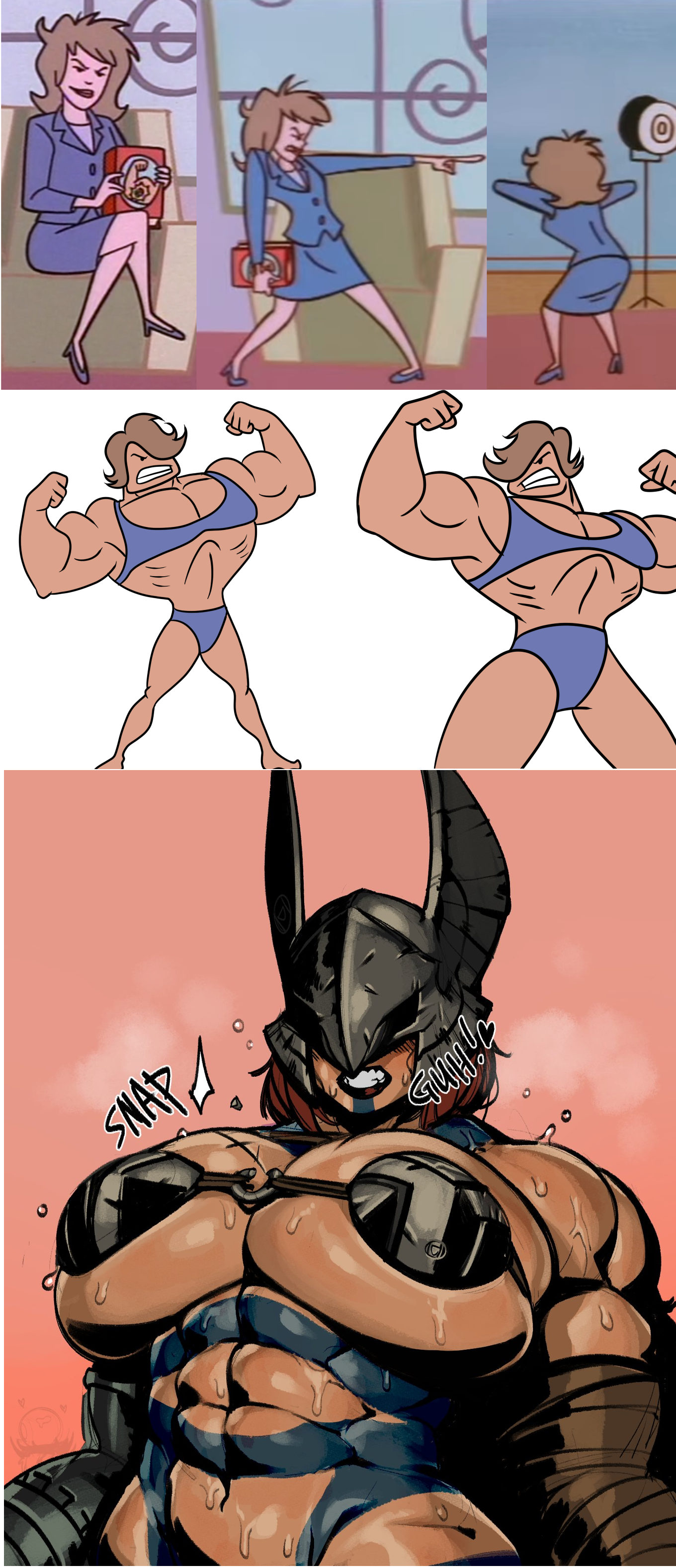Requesting Echo from Clown Corps having a wardrobe malfunction, kind of like the comic on the far right. The top-left reference is her ‘villain’ uniform, and the bottom one is her civilian look.