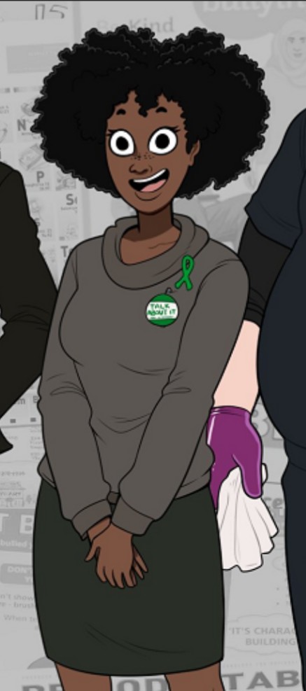 >>152608842Green Ribbon is symbol of mental health awareness. I presume she's a student counselor.
