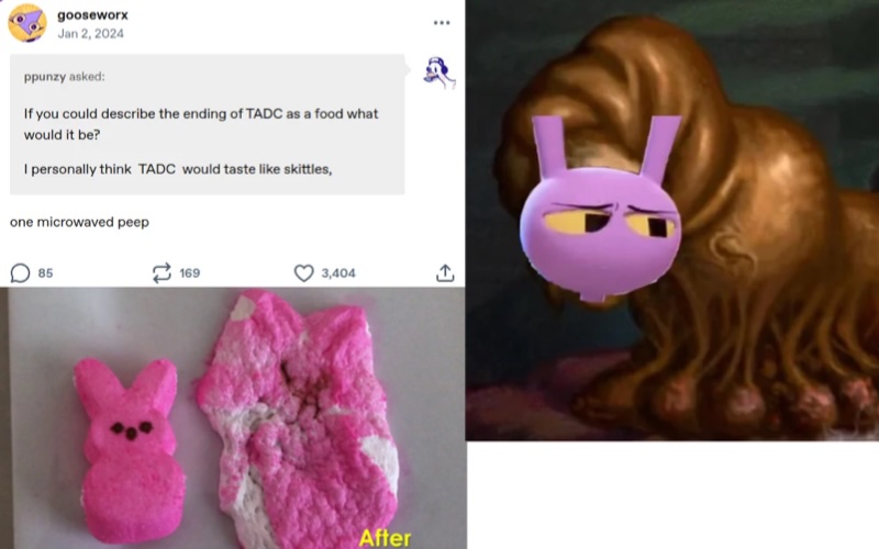 >>152615780Wow, that was a deeply touching song and I got misty eyed listening to that. Thank you for sharing that with me! >I ask you how you're doing and I let you lie>But we don't have to talk about it>I can walk you home and practice method actingI'll pretend being with you doesn't feel like drowning>Tellin' you it's nice to see how good you're doing>Even though we know it isn't trueThese lines were daggers to the heart! Knowing he's suffering and being helpless to move him in any substantial way. That type of powerlessness is painful, when you simply "don't get" someone and want to be there for them, but constantly letting them down because you'll never meet their expectations. I relate to Ragatha so bad... It hurts that even Gooseworx doesn't even care about her lmao >>152616090He was hyperfocused on just how much attention Ragatha was directing toward Pomni, since she was new and still adjusting to the circus. Jax might have been resentful of how Ragatha must have smothered him in the past, especially after Ribbit abstracted. I like to delude myself into thinking he could have also been jealous and was shaming Ragatha in an attempt to keep her from forming a bond with Pomni. Being forced to witness a healthy dynamic where someone who is hurt accepts comforting from someone who wants to be useful and serving that purpose might make him regret pushing Ragatha away. >>152612416I think Kinger is lucid in the dark when he has someone to talk to, but it's possible he comforts himself with memories of his wife when he sits in the dark alone. They are simply trying to survive and that's how he copes with being in that digital hellscape. He's at the base level of his hierarchy of needs and he's just barely getting by, himself. You have to remember that he lost his wife and has been in the circus longer than anyone else, its a miracle he has lasted as long as he has. >>152612695I'd be flirty with Caine if I knew it would make him leave me alone.