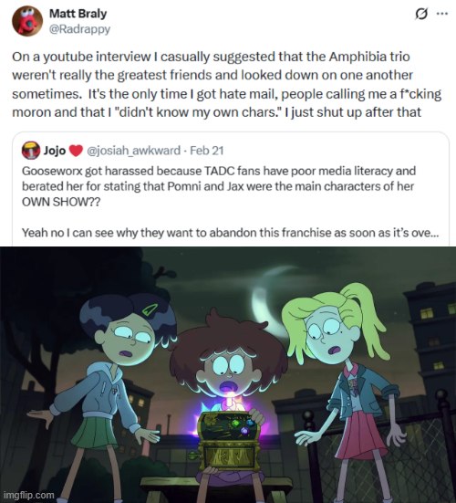 >>152608231>Goose says Jax and Pomni are main characters>Ragfags are upset as many thought Ragatha was also a main character>Huge Reddit post drops because of this, critiquing the writing>Goose responds with out reading the post, and is called out by someone who didn't know it was Goose>Goose deletes her Reddit account and has a small breakdown on Blusky>A bunch of people scream about Goose being harassed off Reddit>Goose comes out and says she just had a mental breakdown, she wasn't harassed on RedditThat's the end of it. From what I've seen the only harassment they faced was one person on Twitter telling Goose to go to hell.