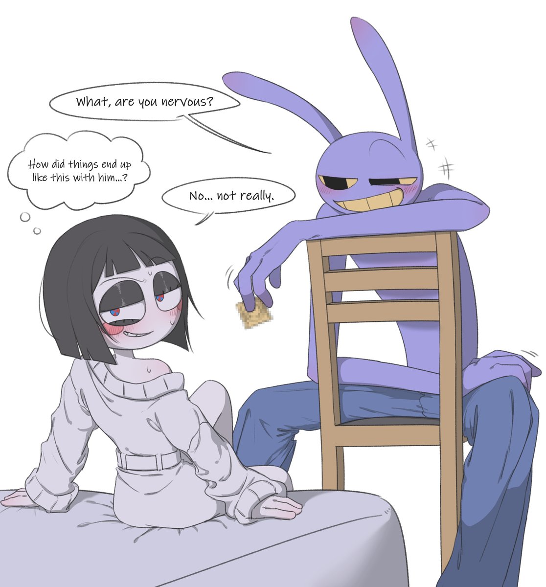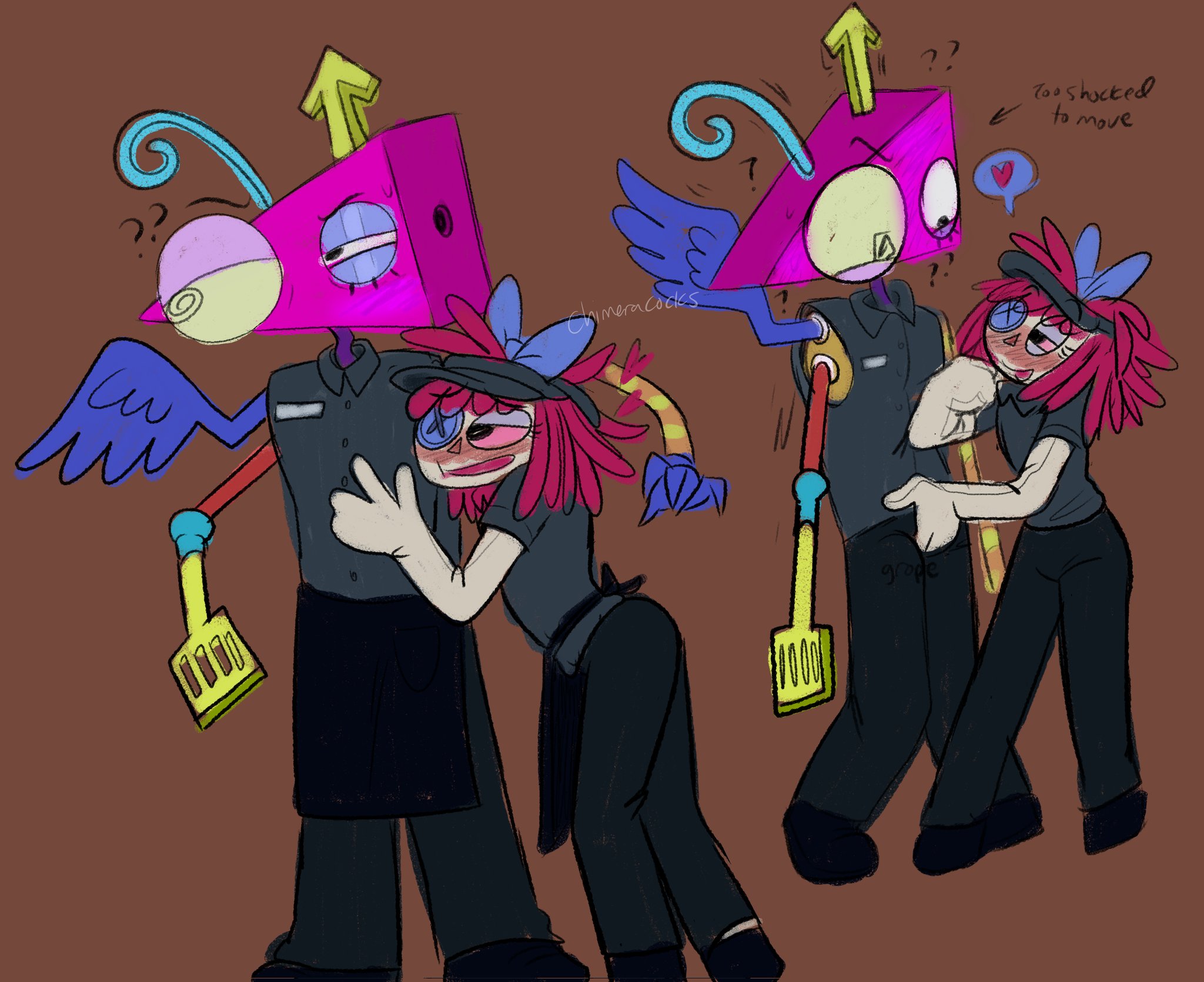 I enjoy the art where he's clearly trying to flirt with Pomni to mess with her and then she starts flirting back and he has no idea what to do in the situation because its never happened before