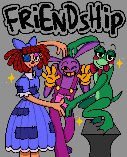 Things Jax should say to his friendsPomni: I really like you and want to be your friend, sorry for pushing you awayGangle: im sorry for taking out my frustrations and anger on you, I appreciate the time we spent together and wish I was kinderRagatha: im sorry for making you so miserable, and not having the same patience for you that you had for meZooble fuck off, cunt