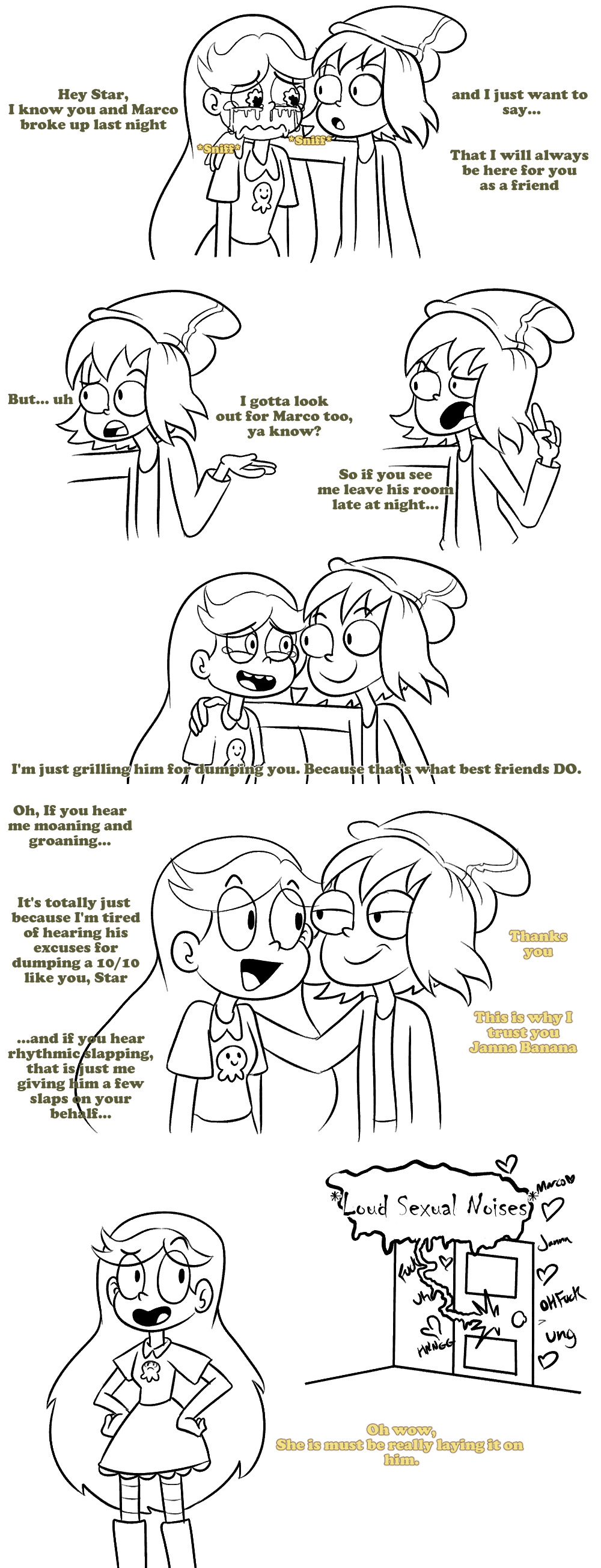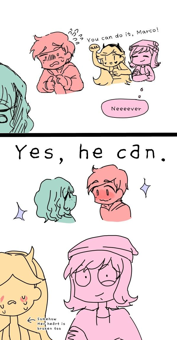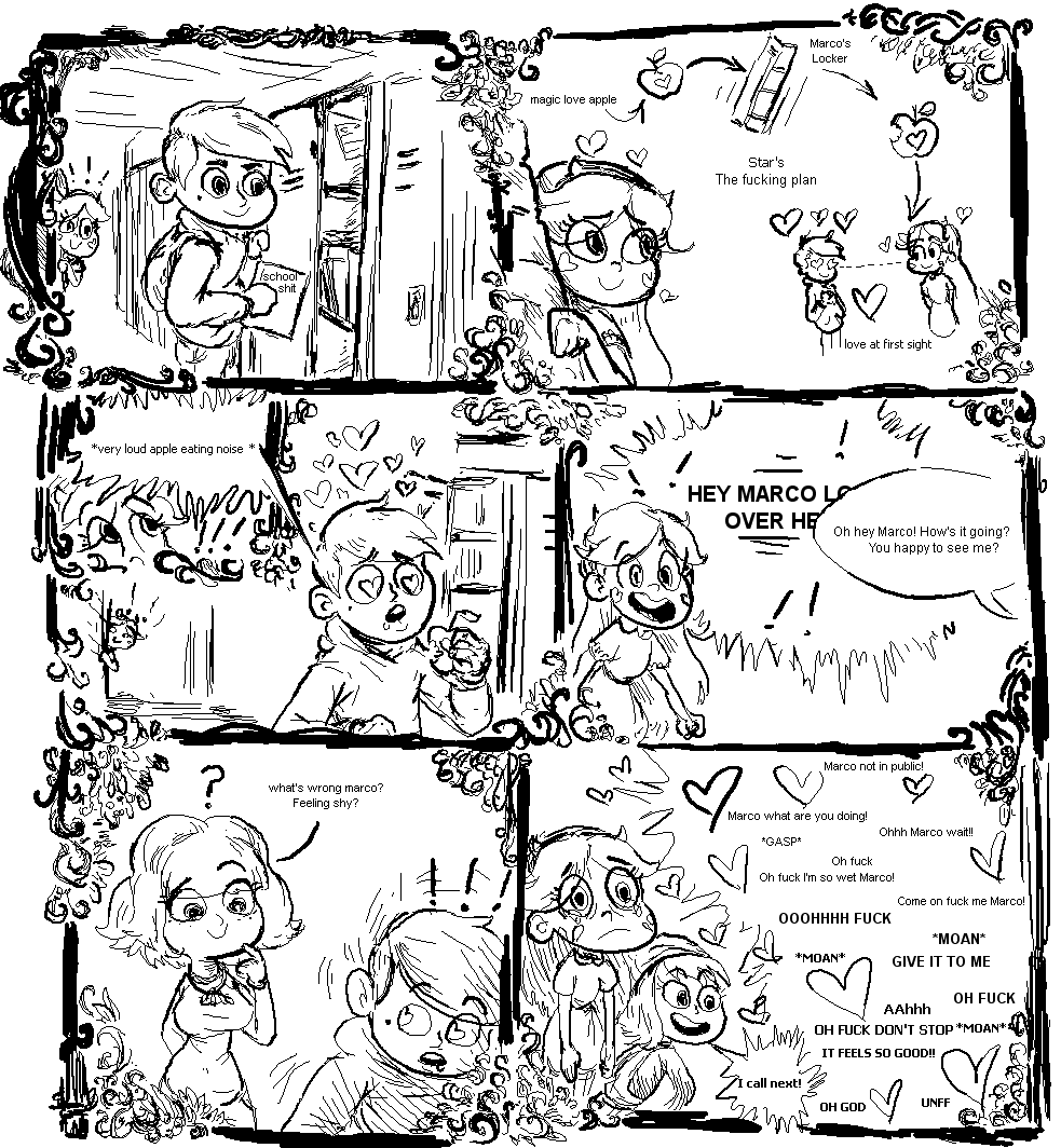 >>152640283Of that specific series, I only have these: - Star baking a cake, walks into Marco in bed with Jackie, Janna is also there and thanks her for the cake.- Star making a love letter to Marco, but he just got a naked pic of Jackie and throws the letter away.- Star walking in on Marco showering together with Jackie and Janna- Star making an apple filled with love potion, but Jackie cuts in front of her and the potion makes Marco do Jackie instead.- Star has to leave the palace, wants to say goodbye to Marco, he is busy with like five girls.if there are others, I'd love to see them.
