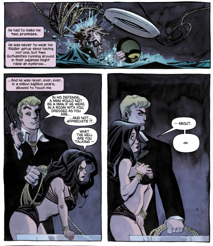 I can't help but notice the double standard in contrast to Batman. Back when Cooke's design was introduced, Batman had just switched back from his all black suit to the classic black/gray. Even now, Selina's recently switched from a modernized take on the purple suit to a dully flashionable black suit while Batman's back in his blue/gray. I'll never understand why his outlandish and more cartoony looks are constantly referenced and reverted to while Selina's past looks are always met with scorn.