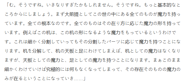 >>152679159Those concepts in question, btw.""Hmm. I see. Perhaps that was a bit too sudden. Alright, let's start with something more fundamental.First and foremost, everything in this world possesses magical power. It is the foundation of all things. Every object has a form of magical power that corresponds to its existence.For example, this desk possesses magical power that allows it to take the shape of a desk. Even if you break it down into smaller parts, each part will retain its own magical power accordingly. If you were to dismantle the desk and separate the tabletop from the legs, the desk itself would lose its magical power, but the tabletop and legs would then each have their own respective magical power.If you were to keep breaking it down further and further, ultimately, nothing would remain—only the magical power of the very essence of its existence would be left..."They aren't even sub thought, they literally die to getting destroyed in the material plane, fuck, they aren't even material plane, this is like the shittiest concepts I have ever seen, can they even count as concepts