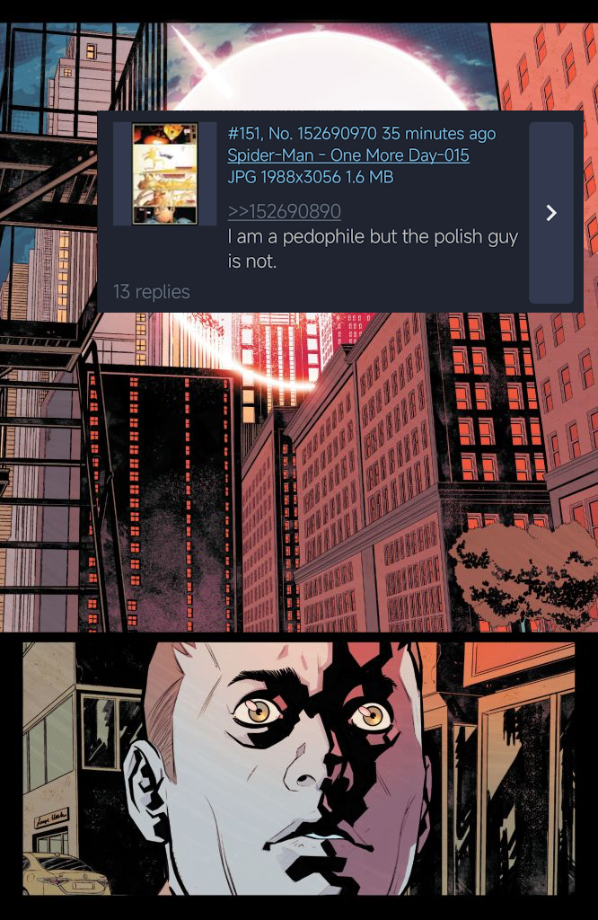 >>152686481What reason does nuPeter have for not telling her the truth? He isn’t a wanted criminal like he was at the start of BND. She doesn’t hate Spider-Man like she may have at some point during BND. All of her memories from the JMS run will return. She isn’t going to die from shock like she was 60 goddamn years ago. She was glad to find out back then. What is the point of keeping it secret?