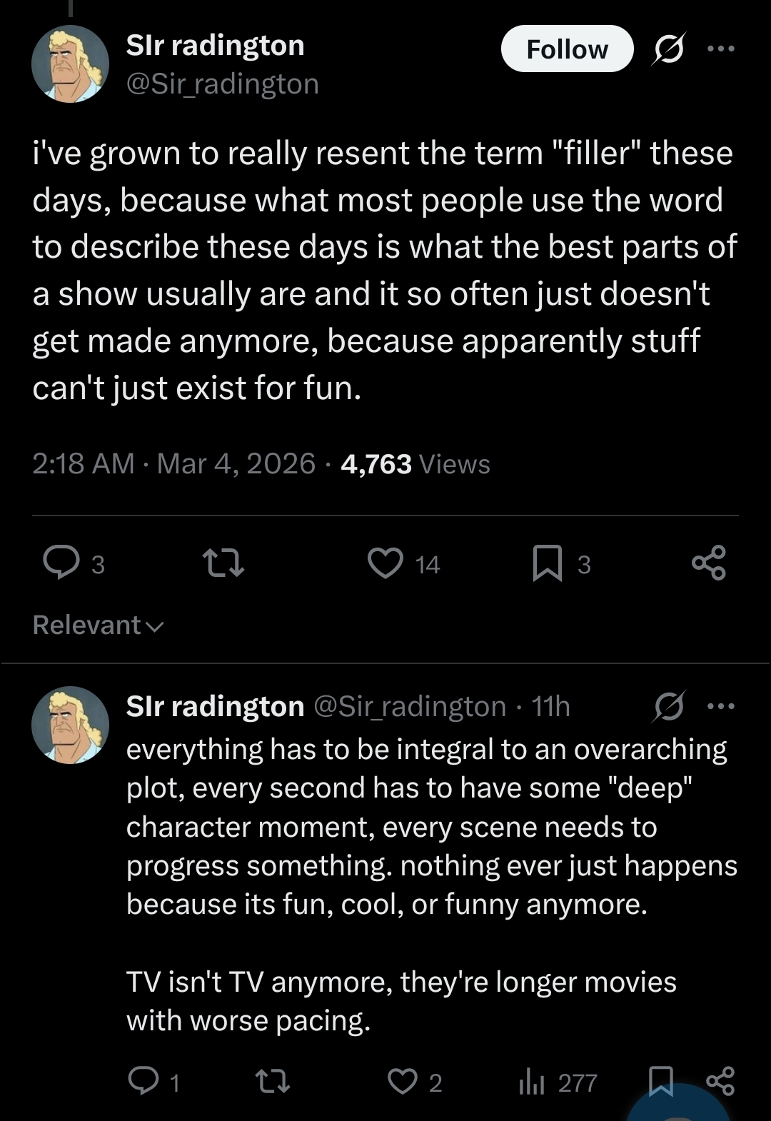 If the "filler" of a show is hated and all people want are more episodes that revolve around the big overarching show, then I think it's fair to say that the show and its characters aren't actually that interesting and no one would enjoy actually getting to see more of them. Episodic shows are fine.