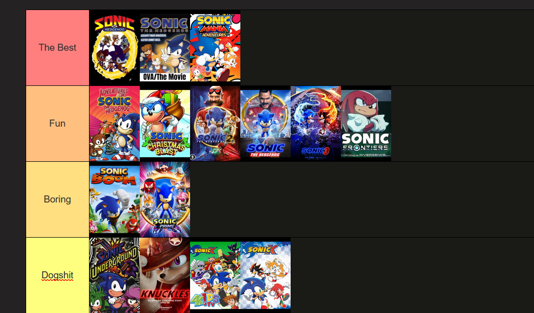 I like sonic boom cus its low stakes sitcom tier you dont have to over think it and its not trying to be dramatic. I hate Sonic Prime on every level I hate multiverse shit I hate the humor I hate the stories its just all shit. the first 3 cartoons are too different to the games for me to enjoy them it just never felt like sonic to me and the freedom fighters stuff are all OCs its hard for me to connect with it. Whereas sonic X has OCs too it balances them with game stuff.