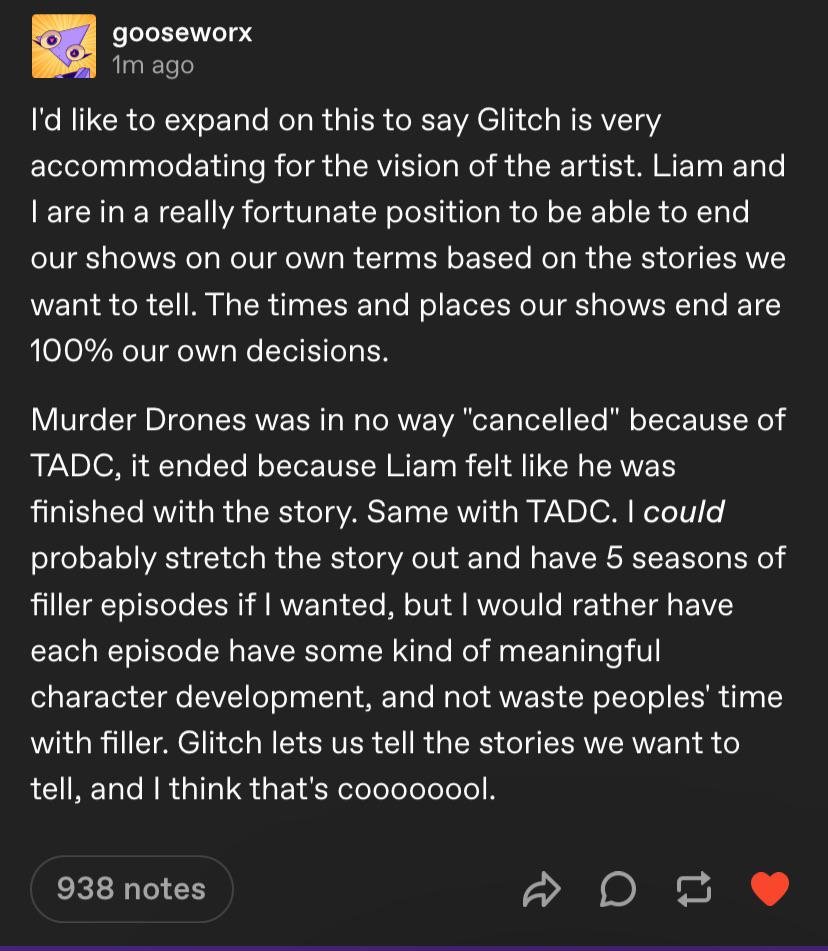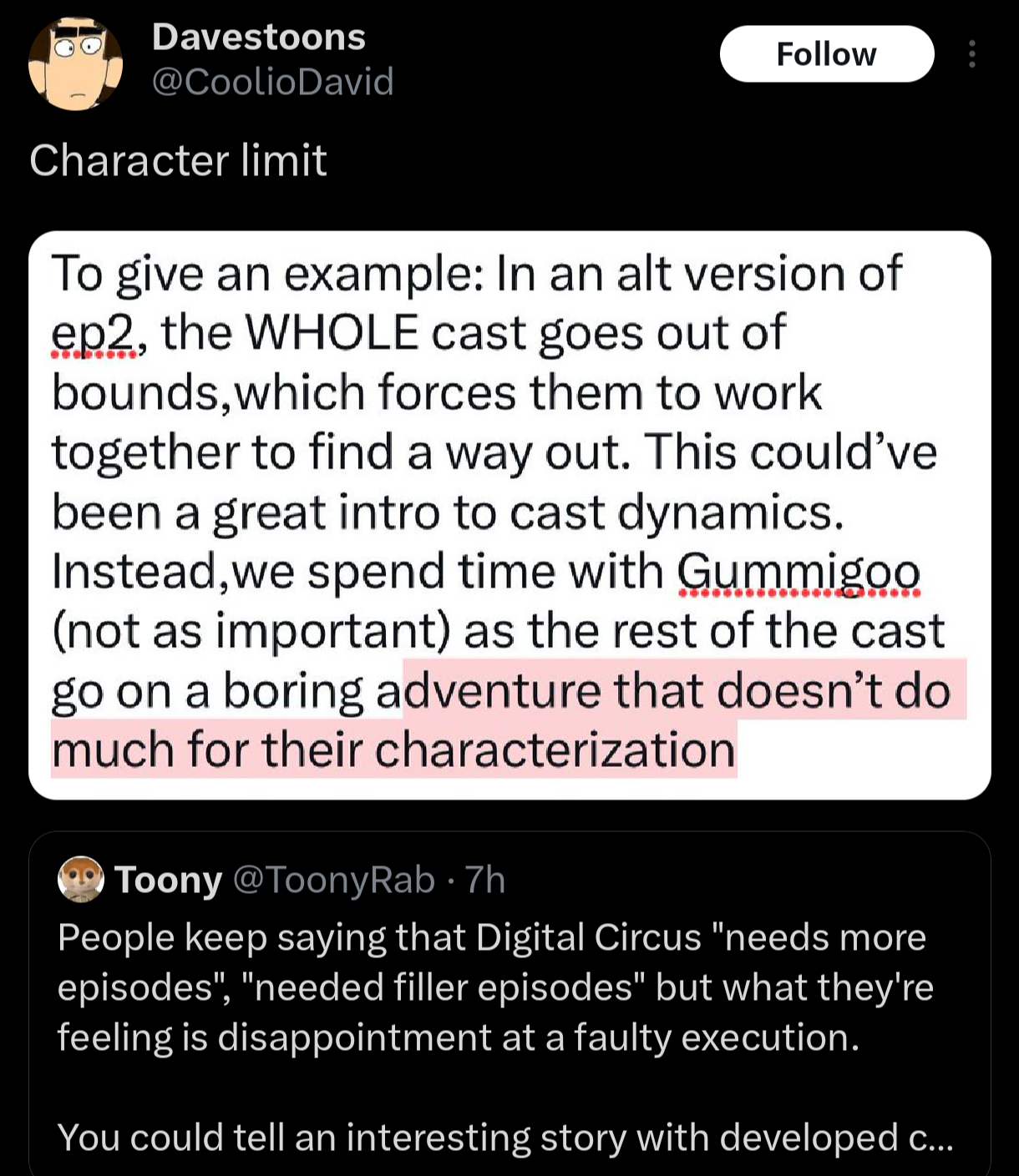 I completely disagree with this. The adventure was fun, and we got to see the characters showcase their personalities fairly well (especially with a hint towards Kinger's lucidity, which is genuinely one of my favorite moments in the show), and the focus on Pomni was really needed this early on. The only mistake was then not capitalizing on Pomni's desire to now bond with everyone in a more casual manner before then trying to give her deep moments with the rest of the cast (third episode and beyond) and then deconstruct all the characters by giving them a mundane adventure (episode four). This is why we needed just one more regular adventure episode to give the setting room to breathe. We don't get a chance to really enjoy a status quo, which I think will make the show really fucking weird to look back on when it's done. I hope the success makes Glitch want to do an OVA or something at some point which is just an early adventure.