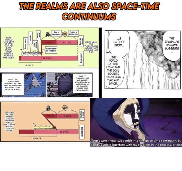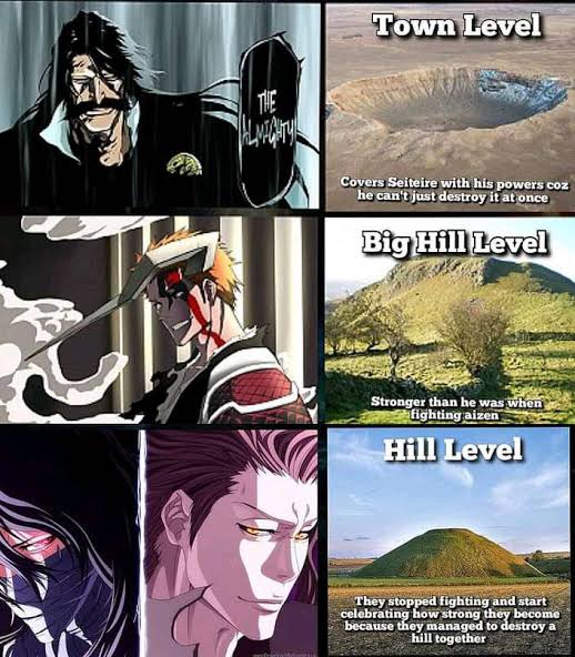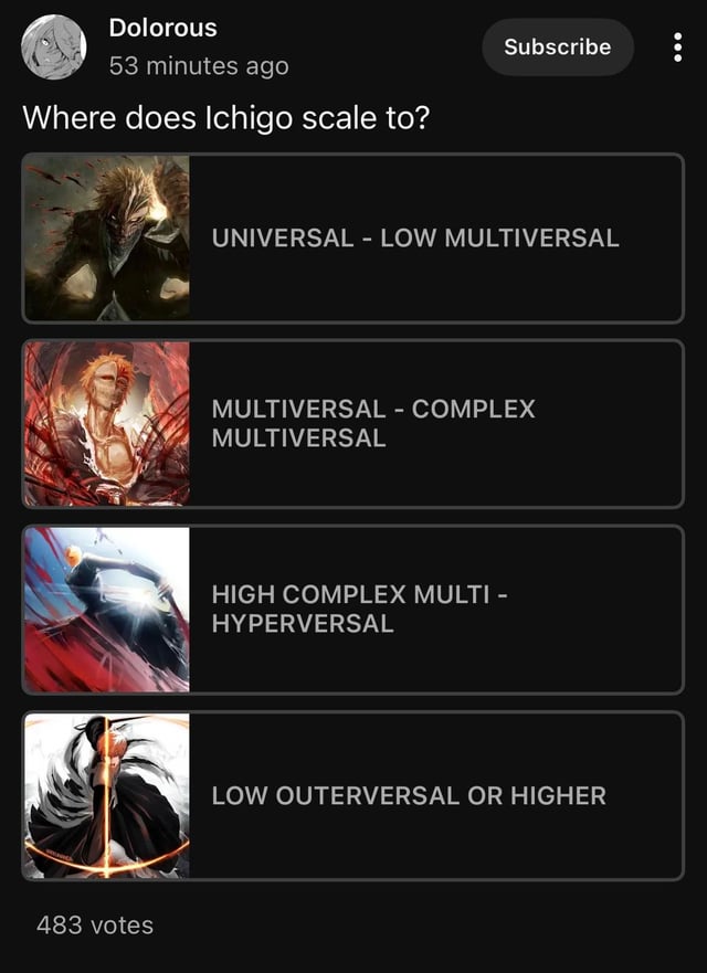 >>152709274The realms Soul Society, World of the Living, Hueco Mundo, are all universal to high universal in size >Soul Society confirmed high universal via the Muken prison being infinitely sizedThis makes up a low multiverse.There's several ways Ichigo scales to this:>Scaling above Senjumaru, wo shook these three realms with her Bankai>Scaling to Yhwach who is capable of destroying, upholding, and merging these realms>The Irazusando test, wherein Ichigo carried a sword of constantly increasing weight to determine whether he would be able to fulfill the role of a Soul King, which is upholding the realms with his powerThere's also stuff like scaling above Gremmy, who created outer space (massively multi-galaxy/universal) and above Yamamoto, who threatened the destruction of the Soul Society (high universal).That's for multiversal scaling. Low complex multiversal scaling is also estabilished, but this involves higher dimensions (Dangai, Garganta).