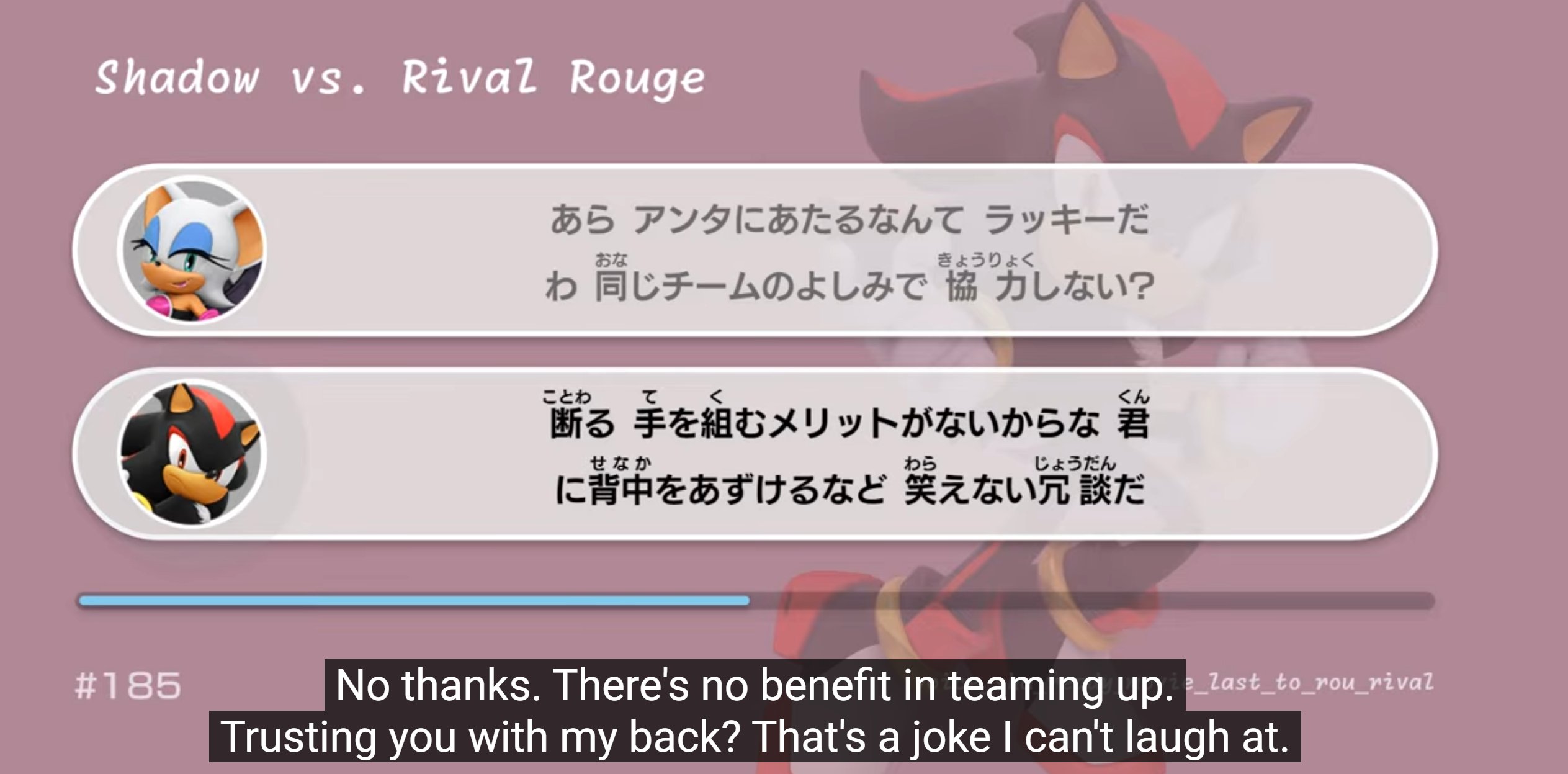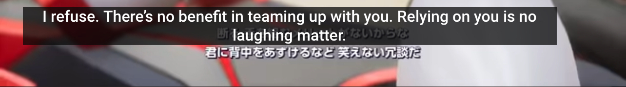 >>152717740Here’s a Japanese (hence, the original) quote from the most recent canon game:"あら アンタにあたるなんて ラッキーだわ\n同じチームのよしみで 協力しない?""断る 手を組むメリットがないからな\n君に背中をあずけるなど 笑えない冗談だ"“Team Up? No way. There's no benefit in teaming up. Trusting you to watch my back is a joke, and not a funny one.”