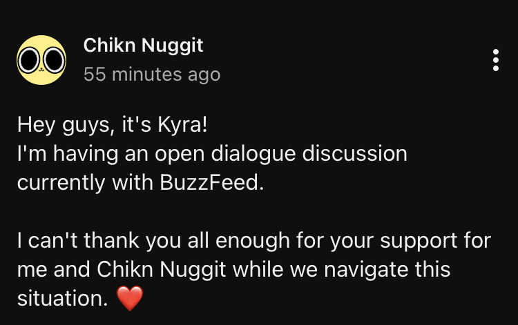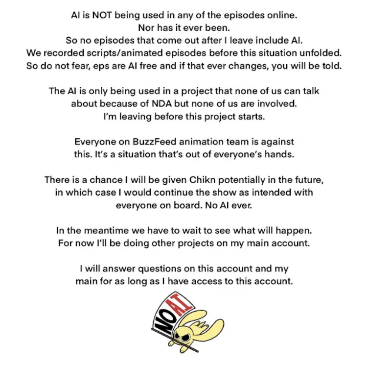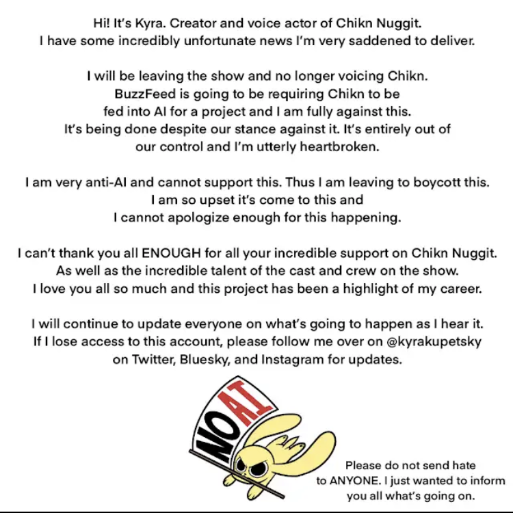 >>152712874>>152712893On one hand, I've heard of Buzzfeed before, but I usually avoid its websites like the plague. Something about that company reeks of the same bullshit vibe I get from Fandom and similar companies. And to be honest, I'm surprised Buzzfeed is still around and that it was involved in Chikn Nuggit's production. As for Kyra, this is literally the first time I've heard of her. And while I have heard of Chikn Nuggit before, but I never watched it.On the other hand, me not being familiar with Kyra and Chikn Nuggit is no reason to dismiss her problems with Buzzfeed and AI. I had a hunch that company was scummy, but it wanting to feed Kyra's Chikn Nuggit characters to AI just confirms my suspicions. This whole situation serves a grim reminder that partnering with a company to produce your content can be a double-edged sword. It's also yet another example of execs using the latest tech and trends as cost-efficient gimmicks that hurt western animation and animators in the long run (2D puppet rigs, storyboarding in recent shows, beanmouth with thin outlines).