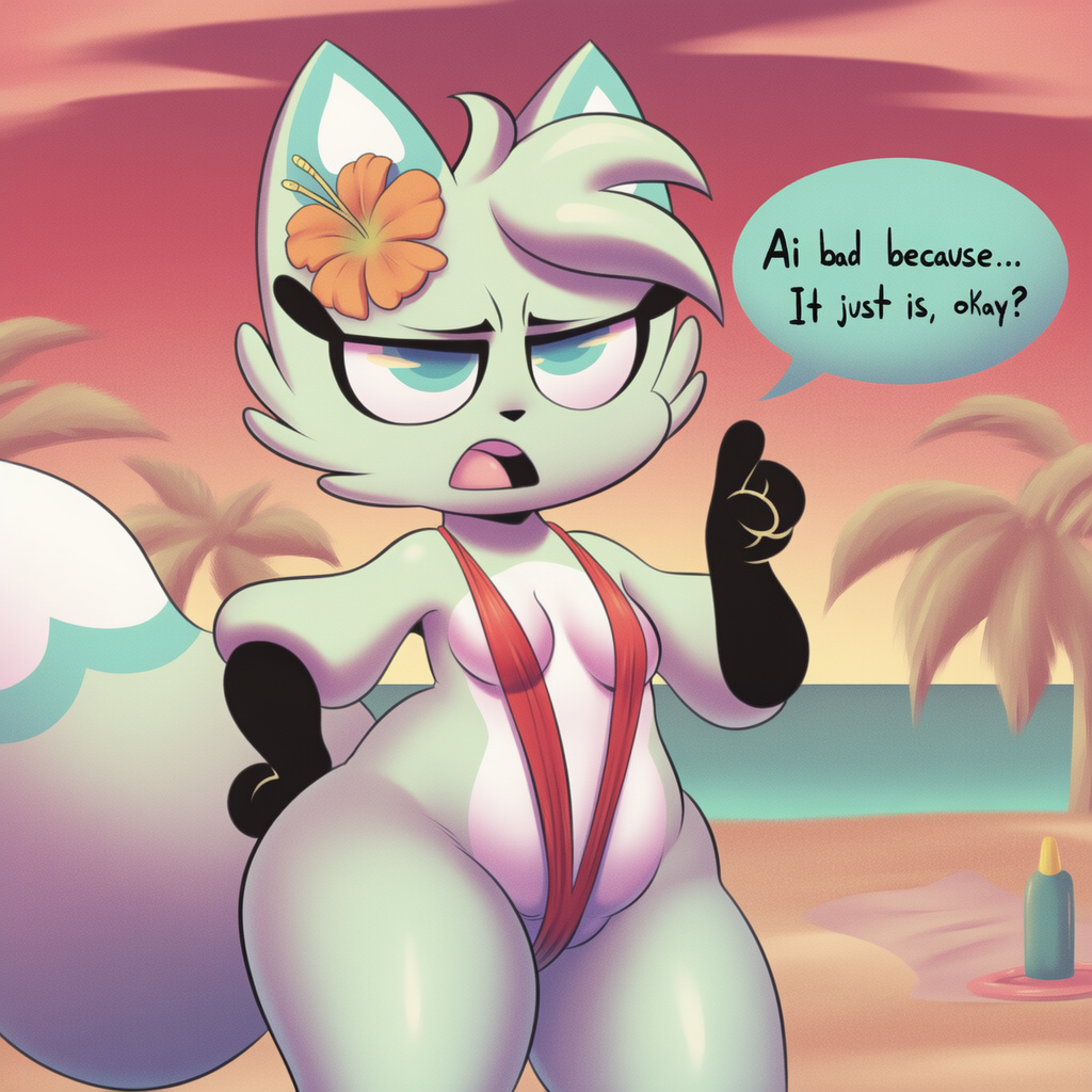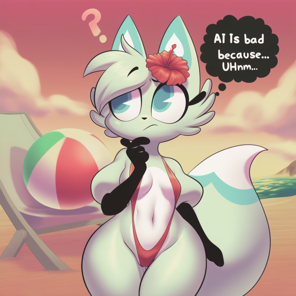 >>152720607Because you're fucking brown.Because you have no control over the output, because when you generate something with AI you're getting a 'fuck it good enough' interpretation of what you gave it, but if you had any artistic vision in the first fucking place it wouldn't match that.Because AI will only ever appeal to people with sub-90 IQ, that have no concept of composition, direction, or subtlety. Because that beach ball is like seven feet wide.