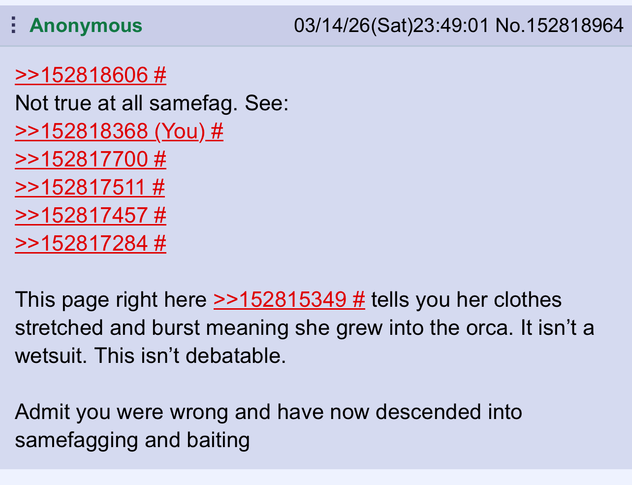 >>152818606Not true at all samefag. See:>>152818368>>152817700>>152817511>>152817457>>152817284This page right here >>152815349 tells you her clothes stretched and burst meaning she grew into the orca. It isn’t a wetsuit. This isn’t debatable. Admit you were wrong and have now descended into samefagging and baiting