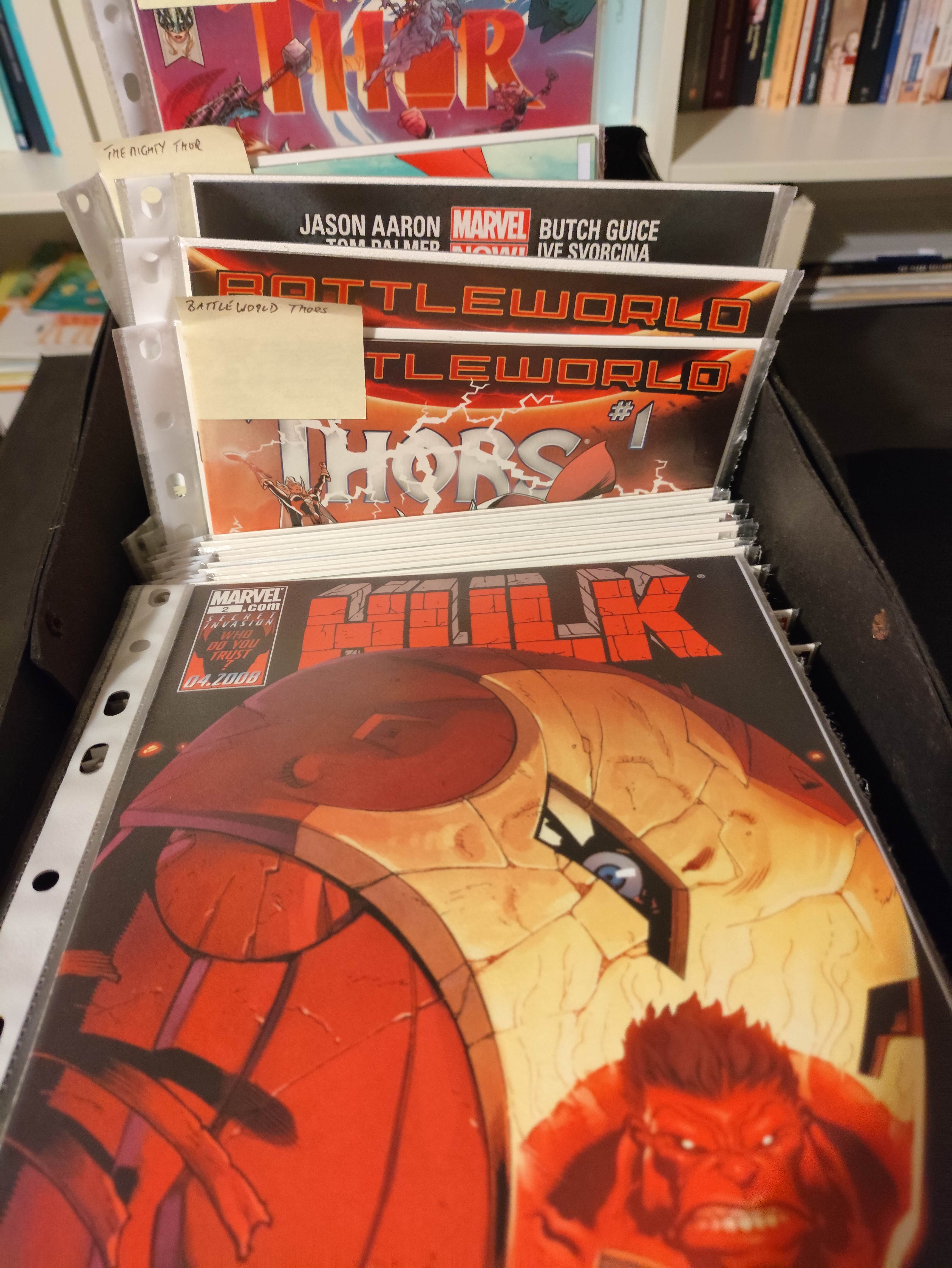 Another box of Hulk and Thor. Looks recent, I can see "Godess of Thunder"-labels and a ton of other labels, looks like a bunch of different series: Mighty Thor Unworthy Thor Death of Thor Battleworld Thor, just how many of those are there? Any of them any good?>>152760185About a grand. Totally worth it, I'd say>>152760299Can do!>>152760408Haven't really seen many, there were some Batman Vs. Something else somewhere