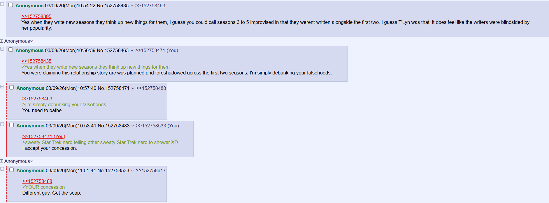 >>152758471>sweaty Star Trek nerd telling other sweaty Star Trek nerd to shower XDI accept your concession.