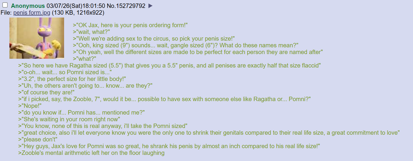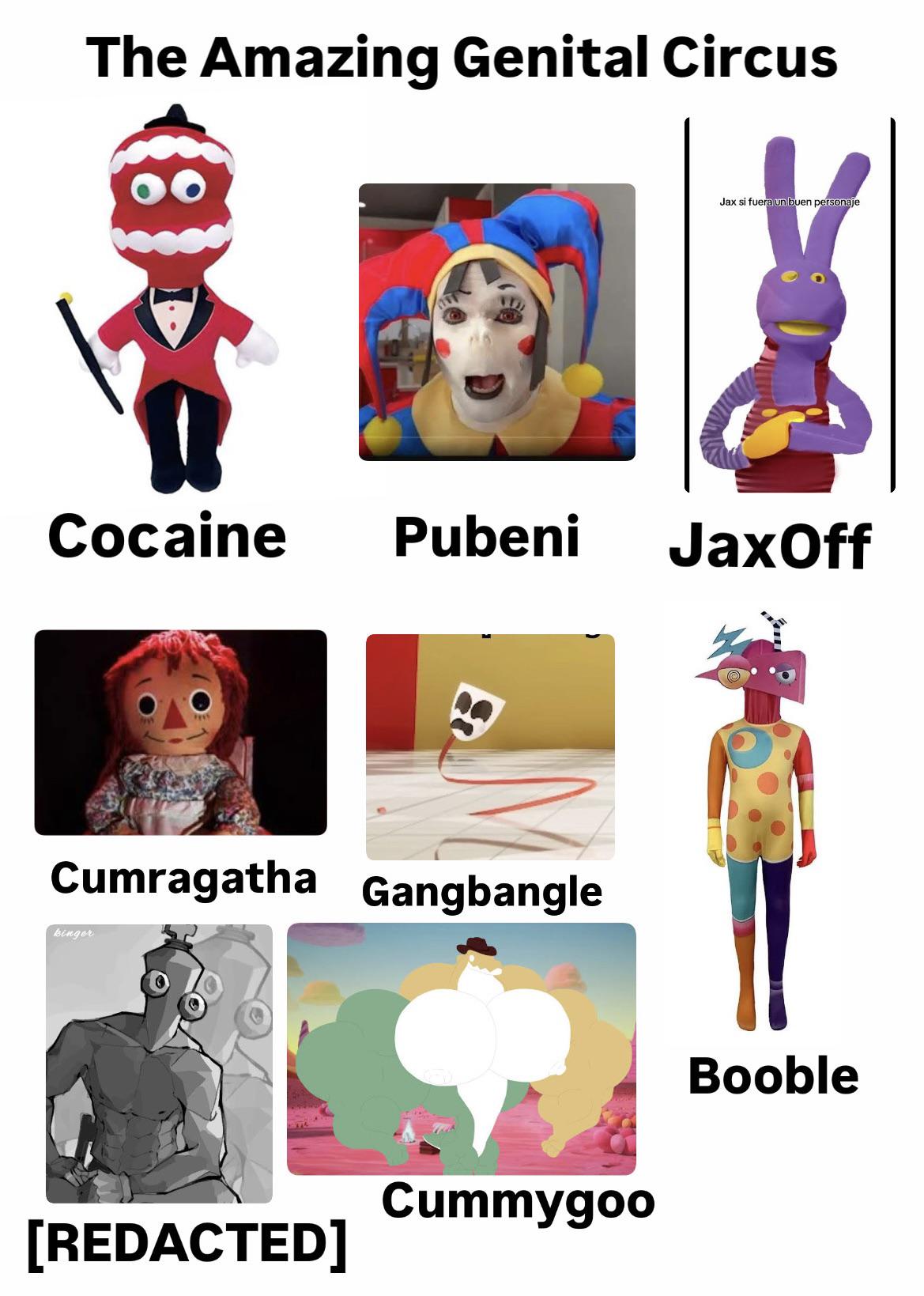 Only pomni has cunny, ragatha and gangle have a pussy (aside from Jax) and zooble has a vegan.