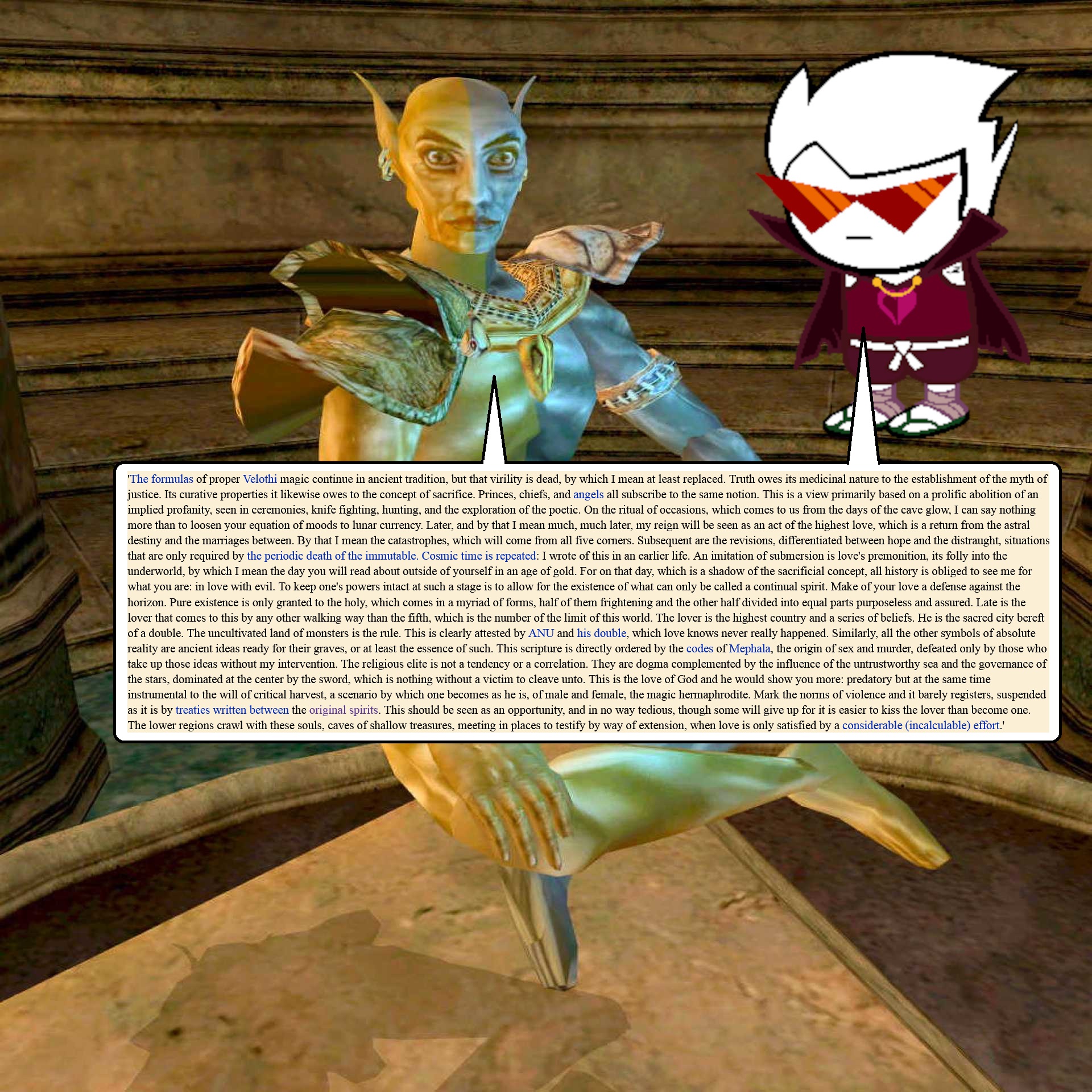 >>152757368Well I don't think Dirk could ever picture himself as happy, or giving up his ego to marry John and achieve Amaranth. It would require John killing Dirk's male ego (who would probably be Ult Dirk) like Jubal-lun-Sun kills Hlaalu Hir (who is Vivec's male ego). Anyway here's the Jubal/Vivec marriage scene but DirkJohn.