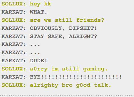 >>152757342>And he writes Dave like a white guy.Even worse, he writes Dave like himself>A lot of the Pesterchum dialogue is based on my own experience with messaging. Particularly Dave's style is modeled after a chatting style I've cultivated with a number of internet friends. Some of his conversations have been lifted word for word from my own chat logs, modified somewhat for context.