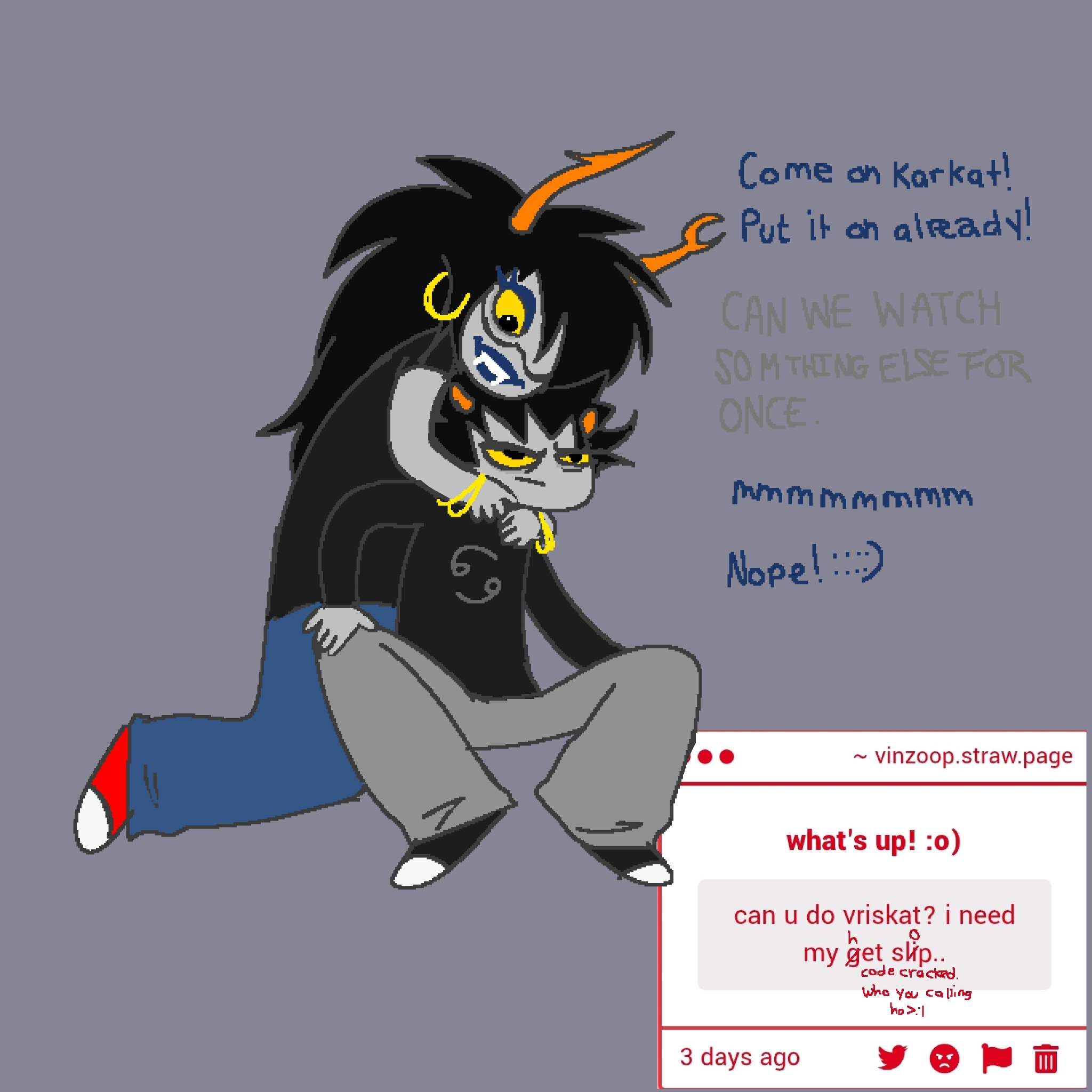 >>152769924that was what i was thinking desu, you got karkat and vriska on your crotch? why waste that chance?