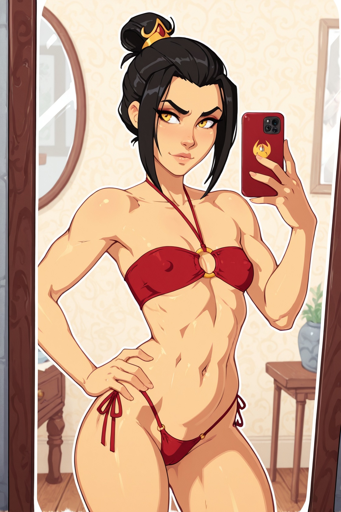 >>1527608641 girl, selfie, mirror selfie, , by owler,{Korra, blue eyes, ponytail, brown hair, dark-skinned female, hair tubes,medium breasts, blue bikini, thong, covered nipples,criss-cross halter|azula, yellow eyes, black hair, topknot, sidelocks, single hair bun, hair ornament,small breasts, red bikini, hand on hip, covered nipples, side-tie thong, petite, bandeau, o-ring}, seductive smile, cameltoe, contrapposto, come hither, seductive, simple background,