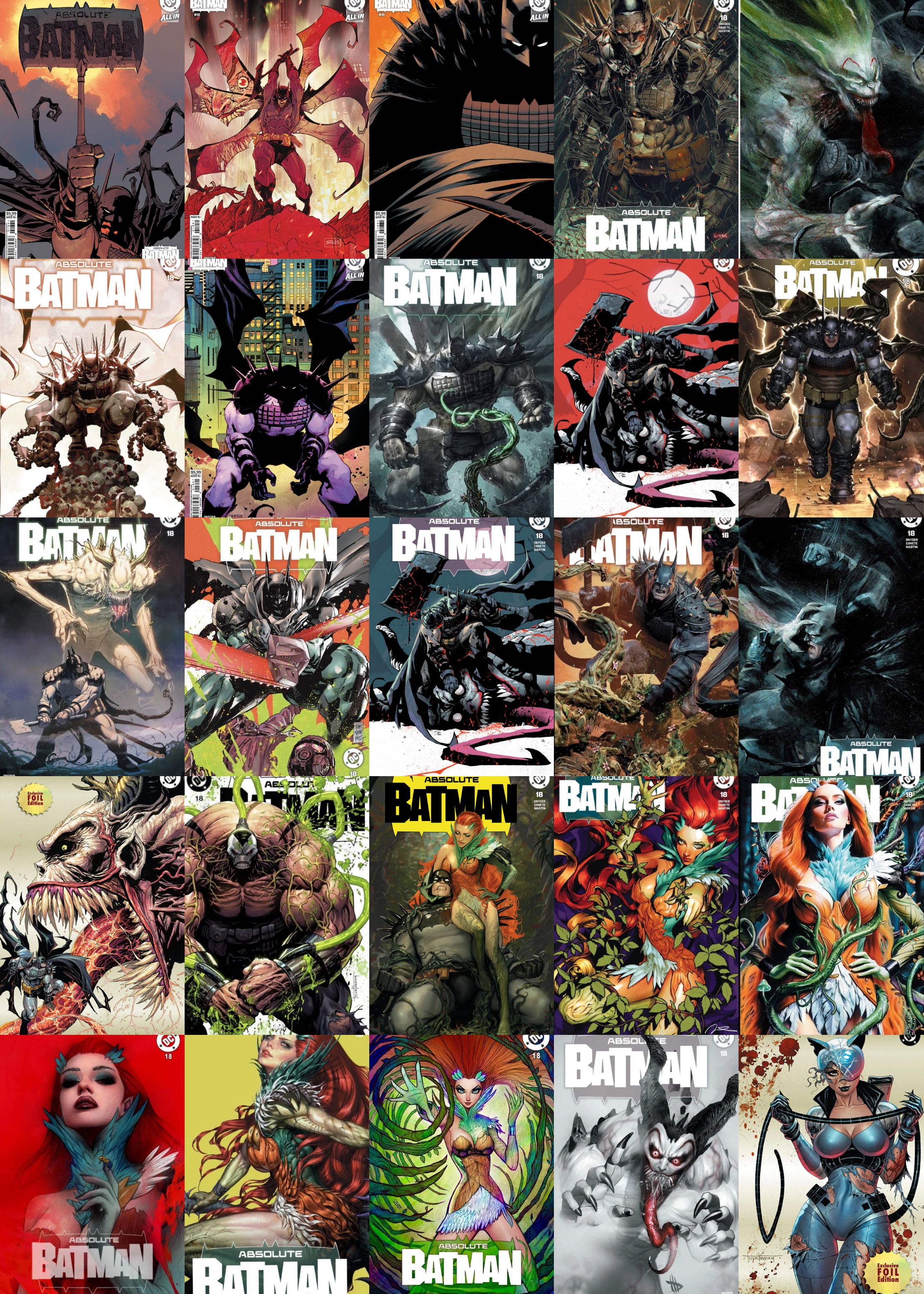 >>152778473>43 variant covers, but most of them are triplatcated.not posting that, you get a collage instead.Absolute Batman #18 Cover B Mahmud Asrar VariantAbsolute Batman #18 Cover C Declan Shalvey VariantAbsolute Batman #18 Cover D Giuseppe Camuncoli VariantAbsolute Batman #18 Cover E 1:25 Carmine Di Giandomenico VariantAbsolute Batman #18 7 Ate 9 / The Comic Mint / East Side / KRS / Sad Lemon InHyuk Lee VariantAbsolute Batman #18 7 Ate 9 Comics / East Side Comics Ben Oliver VariantAbsolute Batman #18 616 Comics / Mike Mayhew Webstore Virgin VariantAbsolute Batman #18 Big Dex Comics Stjepan Šejić Virgin VariantAbsolute Batman #18 Big Time Collectibles Kael Ngu VariantAbsolute Batman #18 Big Time Collectible’s MegaCon Orlando 2026 Dexter soja VariantAbsolute Batman #18 Black Saber Comics KyuYong Eom VariantAbsolute Batman #18 Clay Mann Webstore Wraparound VariantAbsolute Batman #18 Comic Inspiration MegaCon 2026 Javier Fernández Foil VariantAbsolute Batman #18 Comic Inspiration MegaCon Orlando 2026 Alan Quah VariantAbsolute Batman #18 Comic Inspiration MegaCon Orlando 2026 Alan Quah Virgin VariantAbsolute Batman #18 Comic Inspiration MegaCon Orlando 2026 Javier Fernández Foil VariantAbsolute Batman #18 Comic Kingdom Creative MegaCon Dave Wilkins Foil Virgin VariantAbsolute Batman #18 Comic Traders Tyler Kirkham Gold Joker Foil Virgin VariantAbsolute Batman #18 Dark Lord Collections MegaCon John Giang Virgin VariantAbsolute Batman #18 East Coast Comics Björn Barends VariantAbsolute Batman #18 East Side Comics / Sad Lemon Comics Nathan Szerdy VariantAbsolute Batman #18 FanExpo Megacon Orlando 2026 Martin Simmonds Connecting Foil VariantAbsolute Batman #18 KRS Comics / Sad Lemon Comics Gerald Parel Foil Virgin VariantAbsolute Batman #18 Scott's Collectables Webstore / FanExpo Megacon Orlando 2026 Martin Simmonds Connecting Foil VariantAbsolute Batman #18 Unknown Comics Tyler Kirkham Battle Damaged Virgin Variant