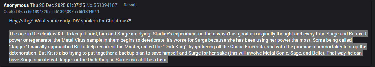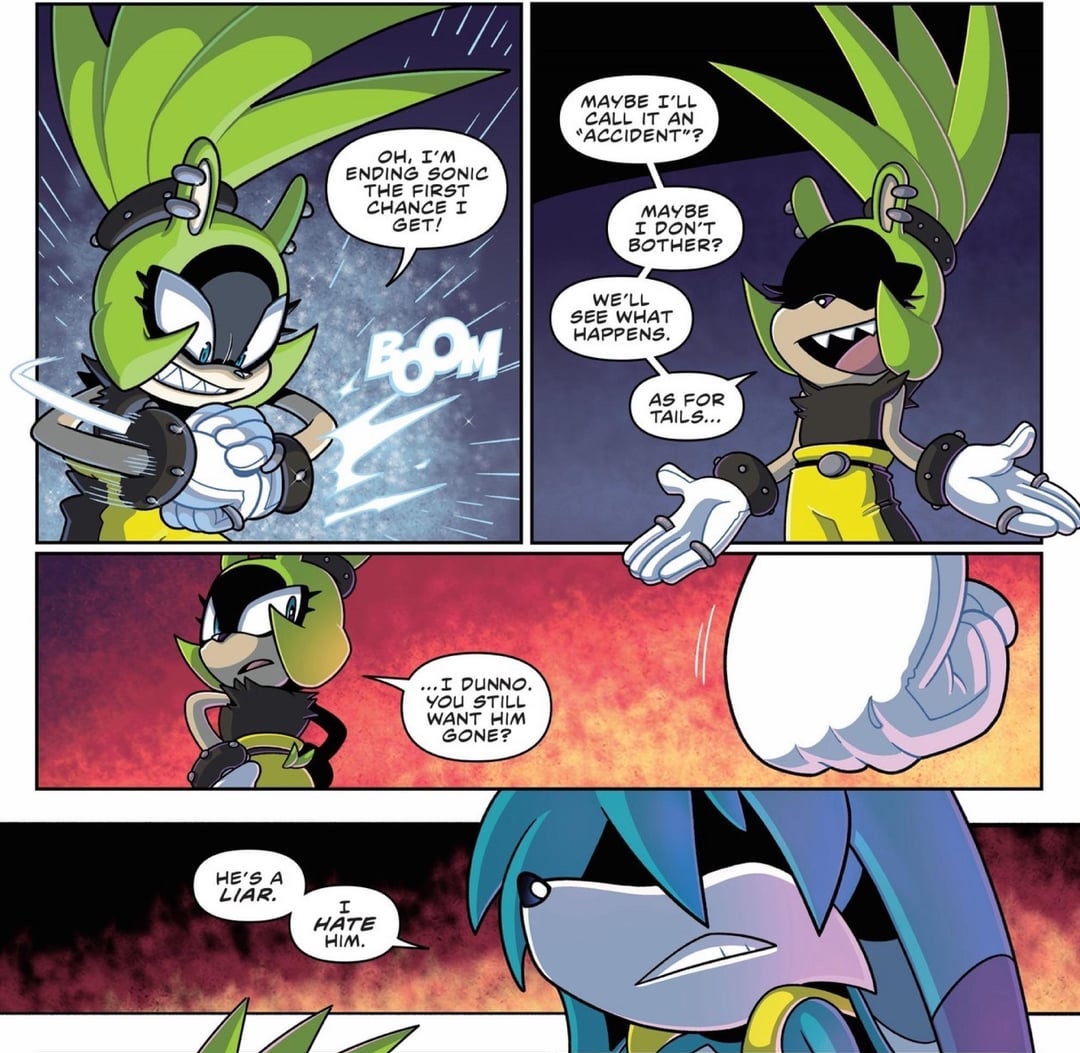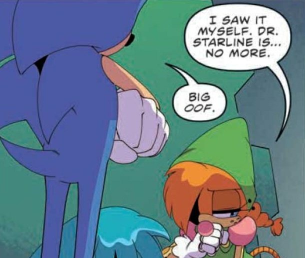 >>152779244>It’s just Starline.I doubt Kit is that mentally compromised he would go back to Starline if it really was him. Granted this is IDW so they can write up any bullshit so who knows.>He lives with Surge and sleeps on a bunkbed with her.It's pretty clear that this cave is Jagger's base of operation not Kit's. Given it was shown there are two conspirators in this story and since Surge anti-hero arc, they have shown periods in which Surge and Kit separate from each other for brief periods of time now. I bet they'll explain it was enough time for Kit to steal the emeralds and give them to Jagger before returning to Surge if this leak is to be believed.