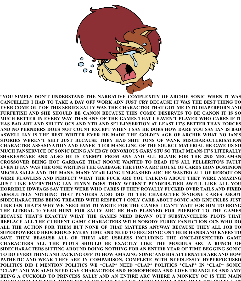 >>152795201>It really is bizarre how they're adding all this weepy LGBT therapy shit into SONIC THE HEDGEHOG of all properties. It's supposed to be about super-speed adventure, not comforting a sobbing wolf.Anon every action story requires drama you can't remove it you can only make it less shit the problem here is that ian and evan pretty much forgot how to write a good drama.