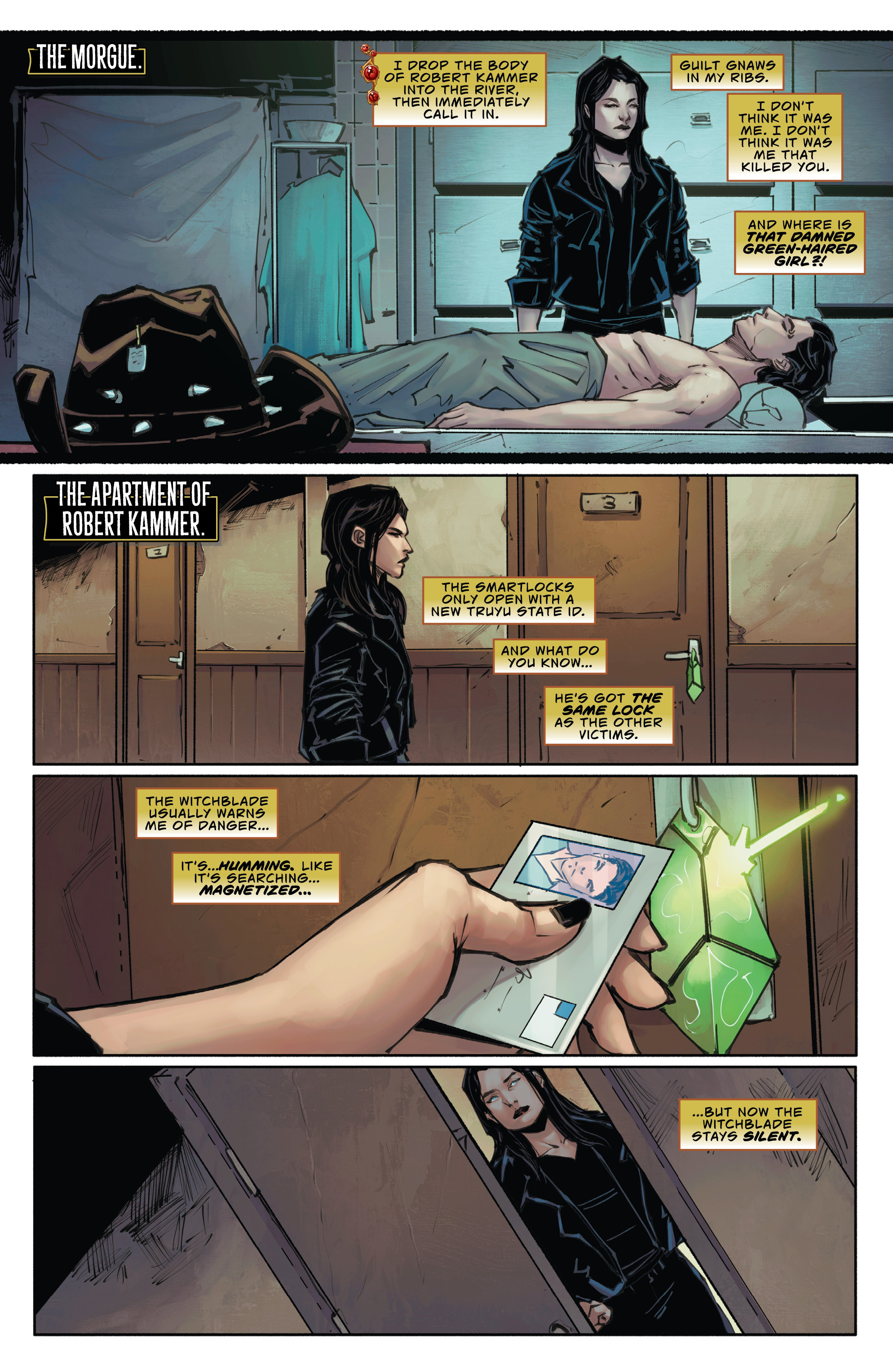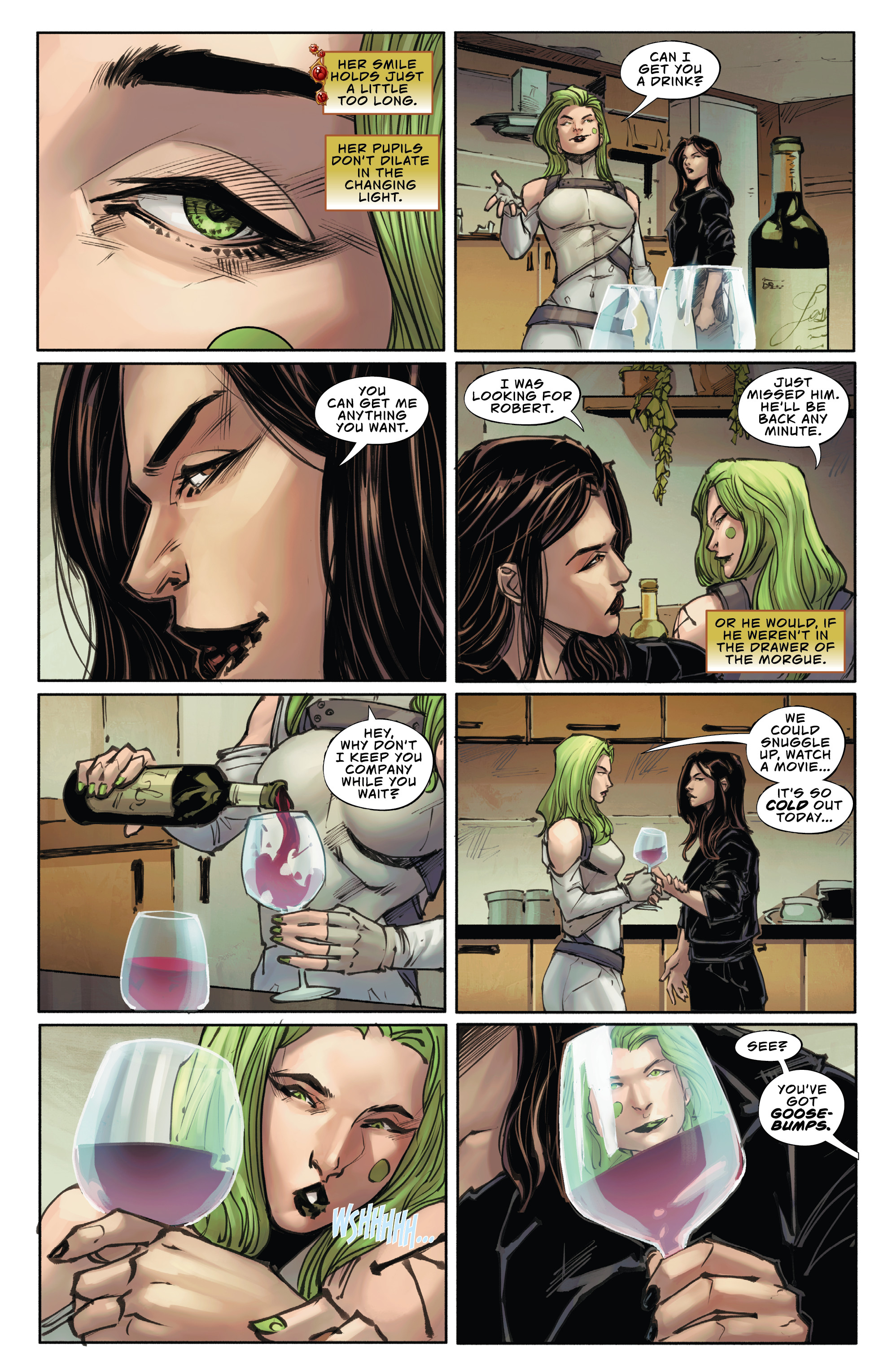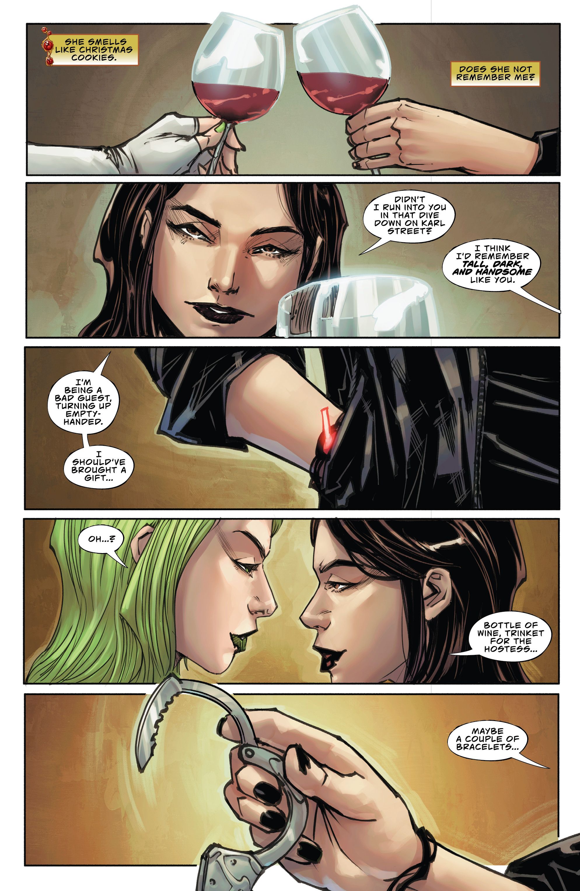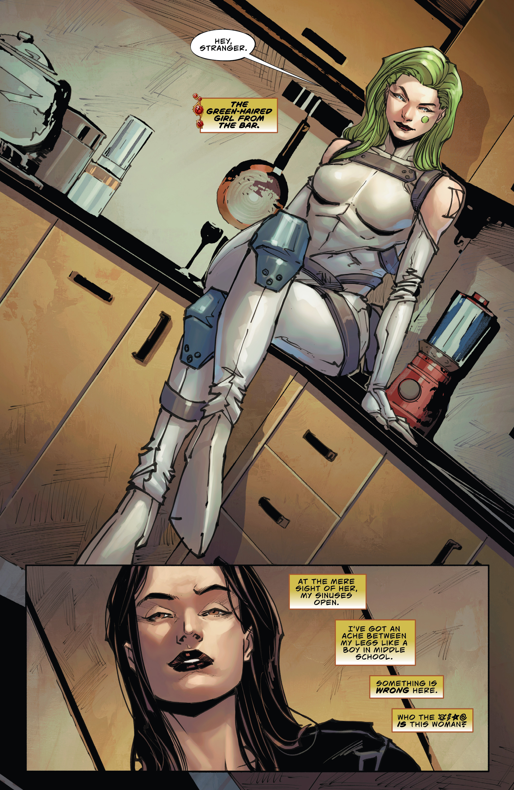 >>152783329Last issue, our heroine Sara had just solved a big case and decided to head into a dive bar, where she got hit on by a guy in a cowboy hat and lady with green hair. That sets the scene for the day after.