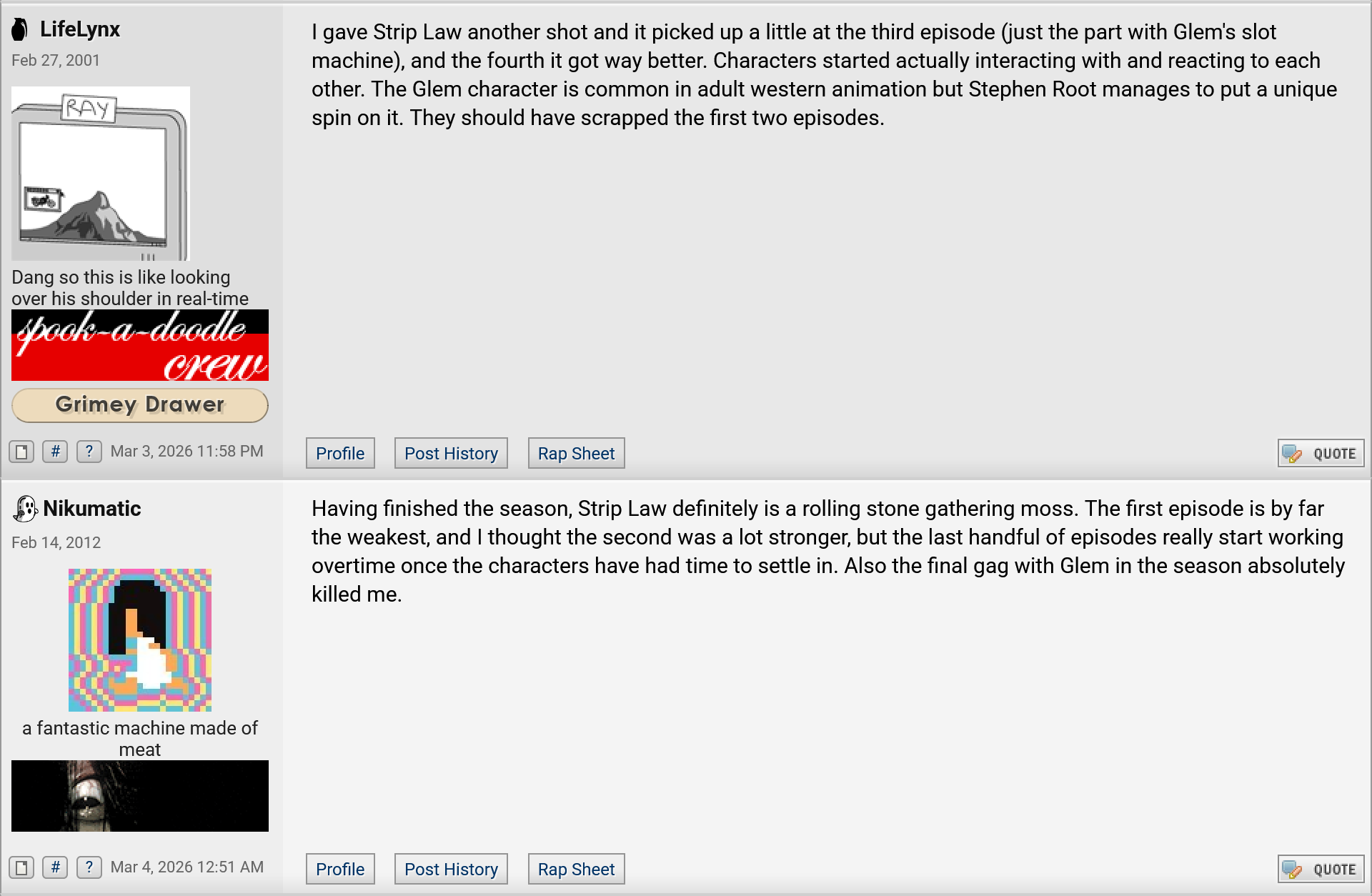 I haven't seen /co/ discussing this ONCE yet. I imagine most people looked at it and thought it was shit. But it's actually kind of amazing. It's like Ugly Americans if it was written by the guys behind Airplane! and Naked Gun. Bit of shared DNA with Grimsburg for sure.I thought I'd hate Irene, but she became extremely likeable. Though she looks out of scale with the others sometimes. And I thought I'd ADORE Glem, but instead I just like him. He occupies a weird niche between Buck Strickland and Bill.It's also amazing how many episodes start out making you worry, then turn out great. The last one actually had me rolling my eyes until they made right on it.