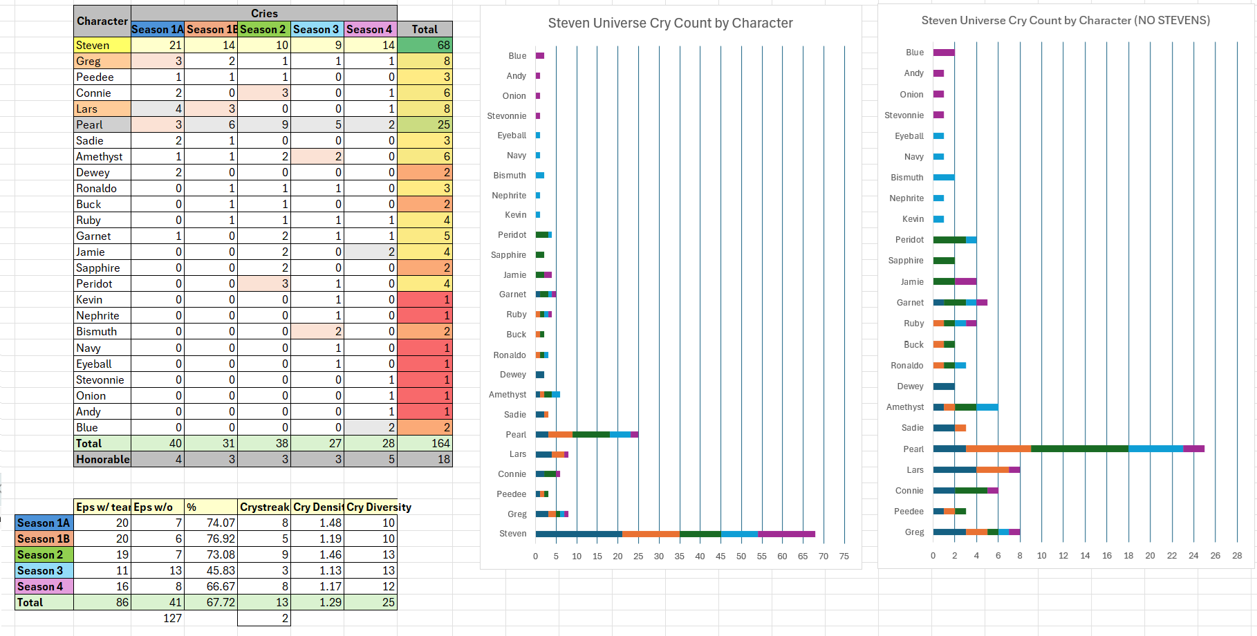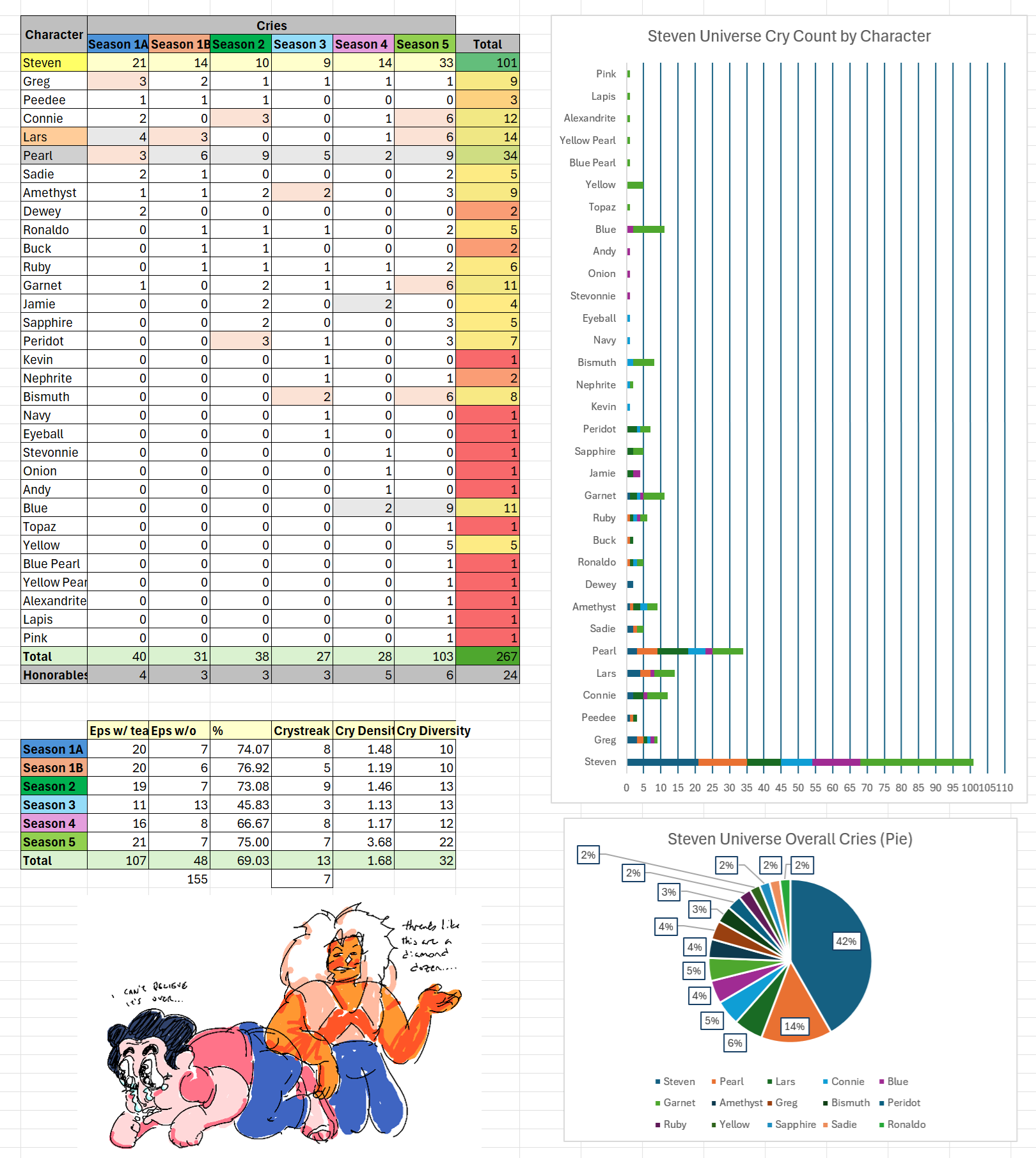>(1/3)Well. This has been quite an emotional rollercoaster. We laughed, we cried, we cried of laughter. Season 5 is jam-fucking-packed with crying. After Seasons 3 and 4 I wasn't expecting much but this season knocked it out of the park. I still can't believe this season had over 100 cries, clearly in no small part to Blue and her ridiculous powers. The cry percentage is a solid 75%, second highest after Season 1B and bringing up our total cry percentage to a (nice) 69%. That means you should expect to see crying in about 7 in every 10 Steven Universe episodes. The cry density is fucking 3.68. Every other season had a cry density from 1-1.5. Again, thanks Blue. Oddly this Season had two unique crystreaks of 7 but it never got higher than that so the best overall crystreak of 13 connecting 1A and 1B was never broken. The cry diversity also skyrocketed to 22. Makes sense with lots of characters returning in the final season.Steven gets gold with 33 goddamn cries. He's gotten gold every season but he finished strong. I actually didn't think he was gonna make it but Steven got past the big hundo with 101 cries throughout the whole series. If you exclude the pilot it's exactly 100 which is pretty funny. Steven also cried more in Season 1 than any other character has through the whole series. It was never close. Steven is our champion, our golden god. 50% human, 50% gem, 100% crybaby.Pearl and Blue are tied for Silver for Season 5. Pearl was always a strong contender and wins Silver overall so it's not surprising to see her up here. She may not cry as much as Steven but she makes her cries count (and still cries more than anyone else.) Newcomer Blue has proven that she can dish it out and she can take it. While being the ultimate supporter and helping everyone else cry she has proven that she's a force in her own right.
