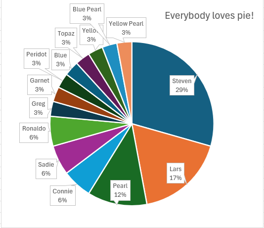 Oh yeah, I also forgot how pie charts worked. I'm not supposed to cut out the tiny data, I'm supposed to clump them together. So Steven ended up with 38% of all the cries through the show. Next is Pearl at 13% and it tapers off from there. Neat.>>152815610>>152815781No prob, bob. I had fun even if it ended up being more daunting than I initially realized.
