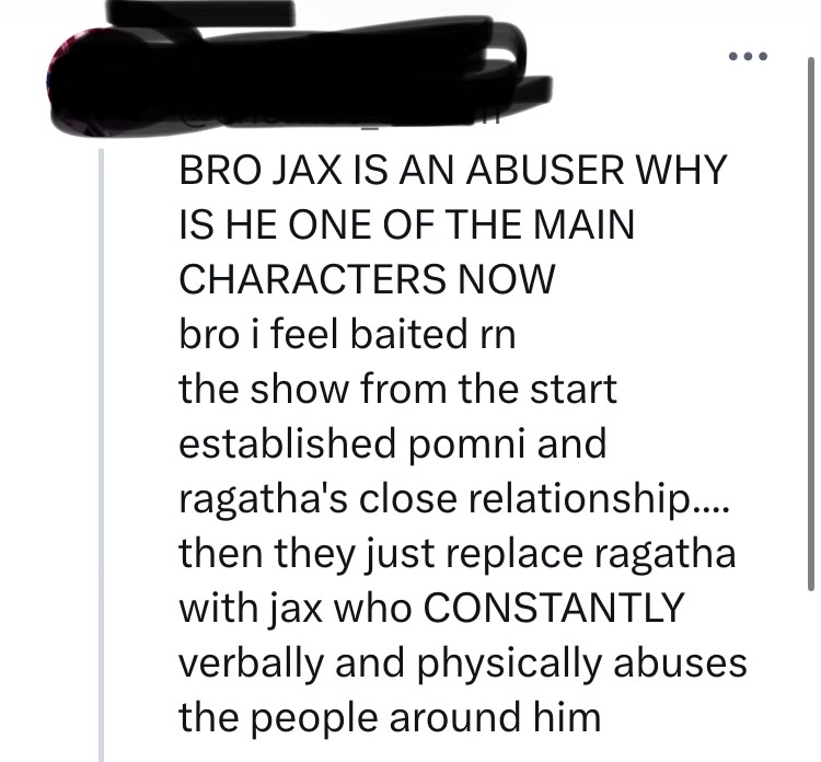 Is Jax really a chud?Dude only made one joke about Zooble's sexuality in the first episode, and that's the closest I remember him doing something chuddy.